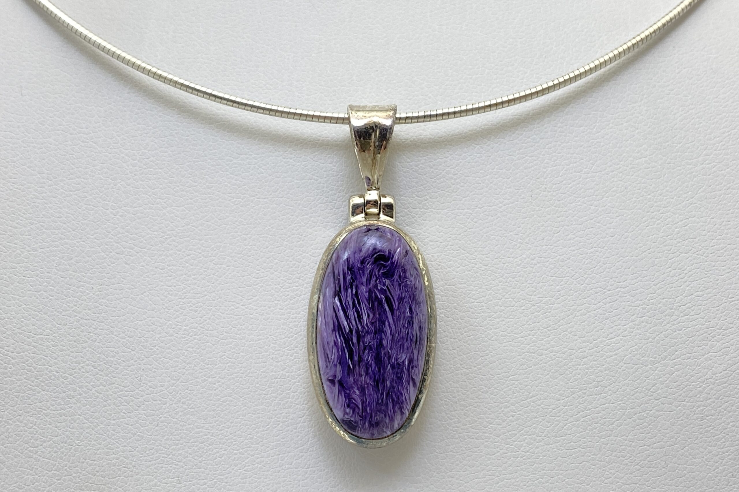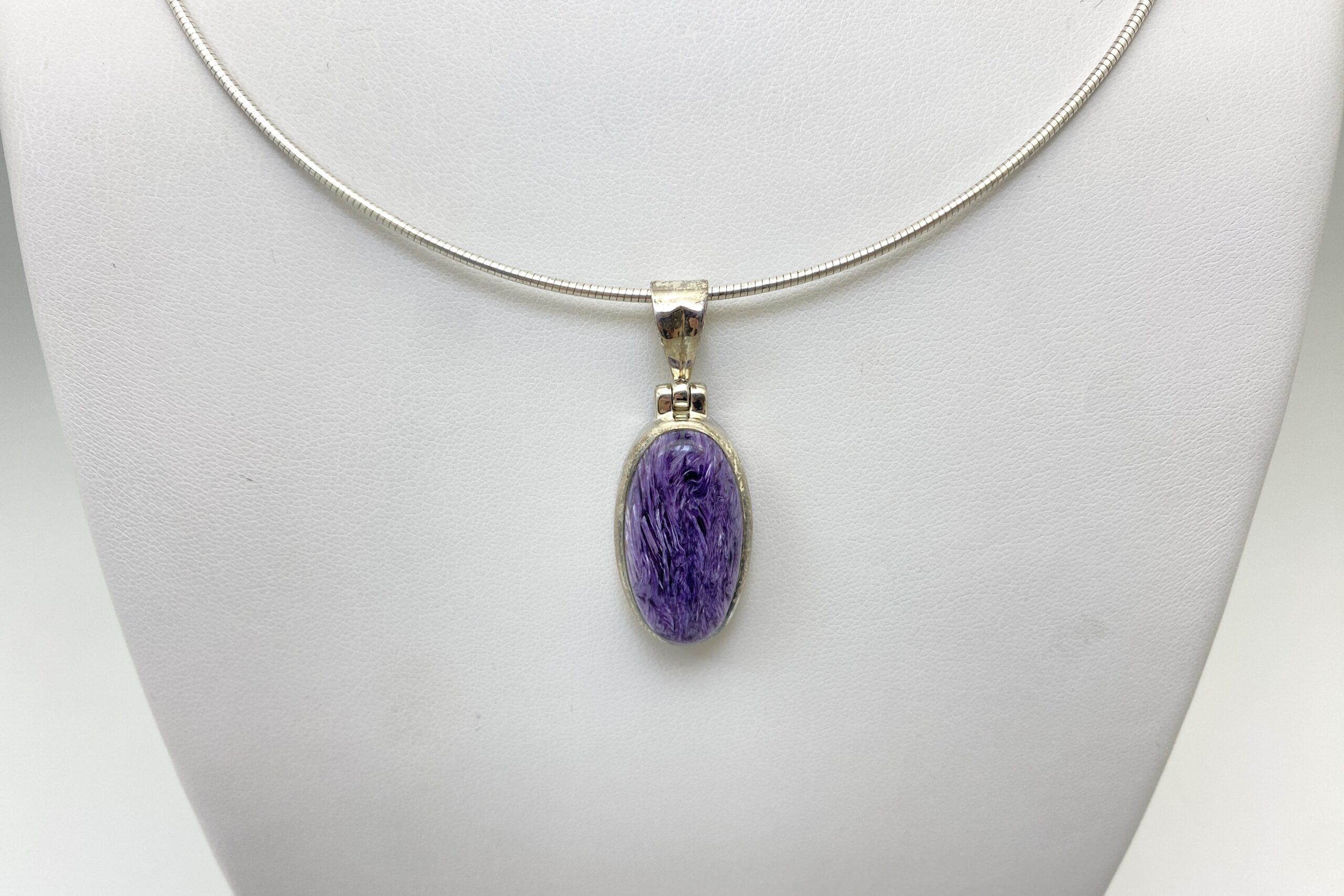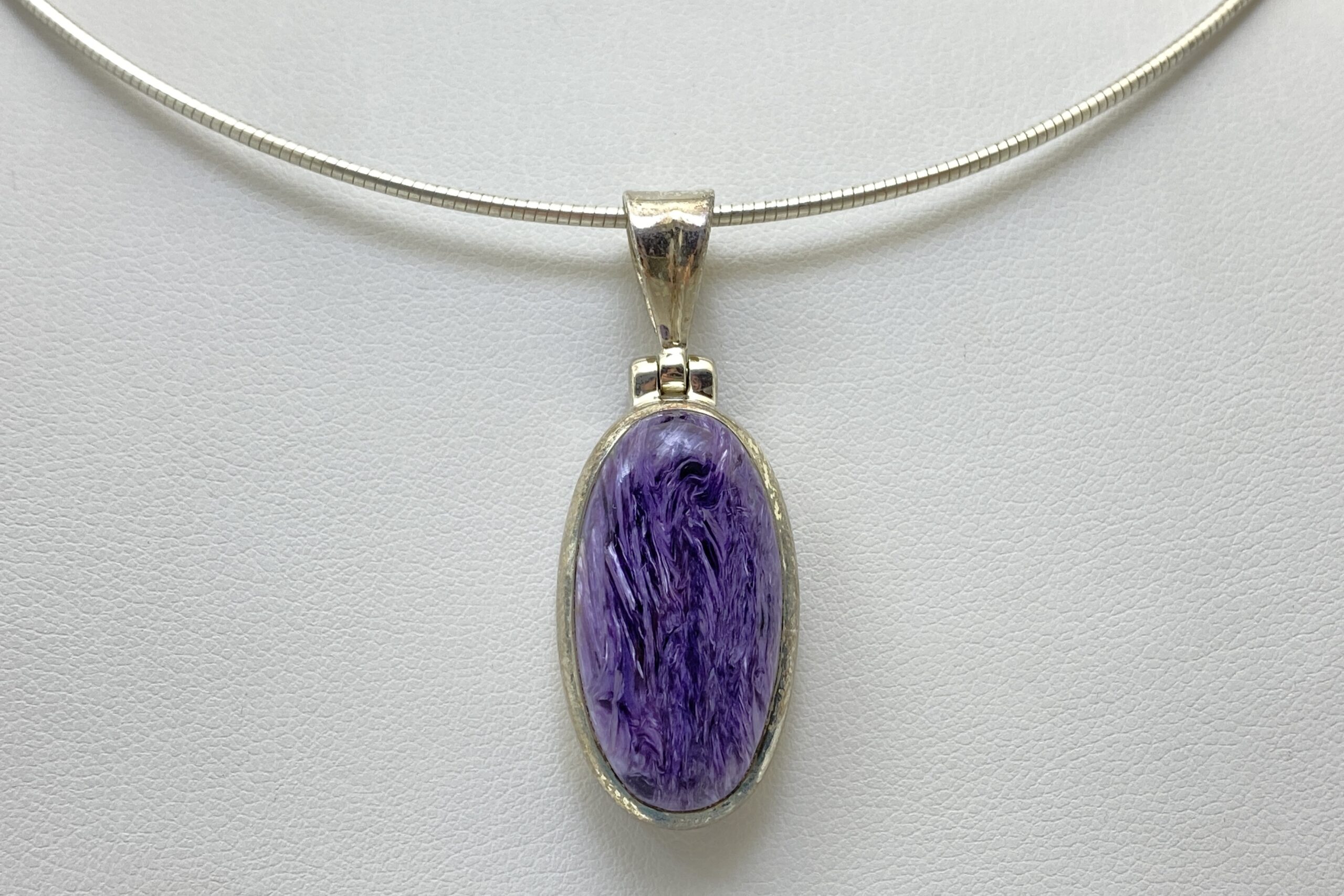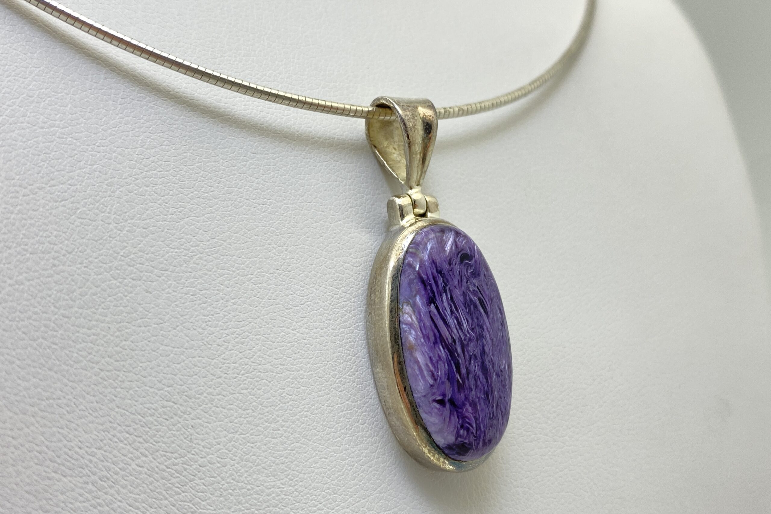 Nádherný unikátní přívěsek s oválným kabošonem překrásného čaroitu se zajímavou přírodní kresbou.