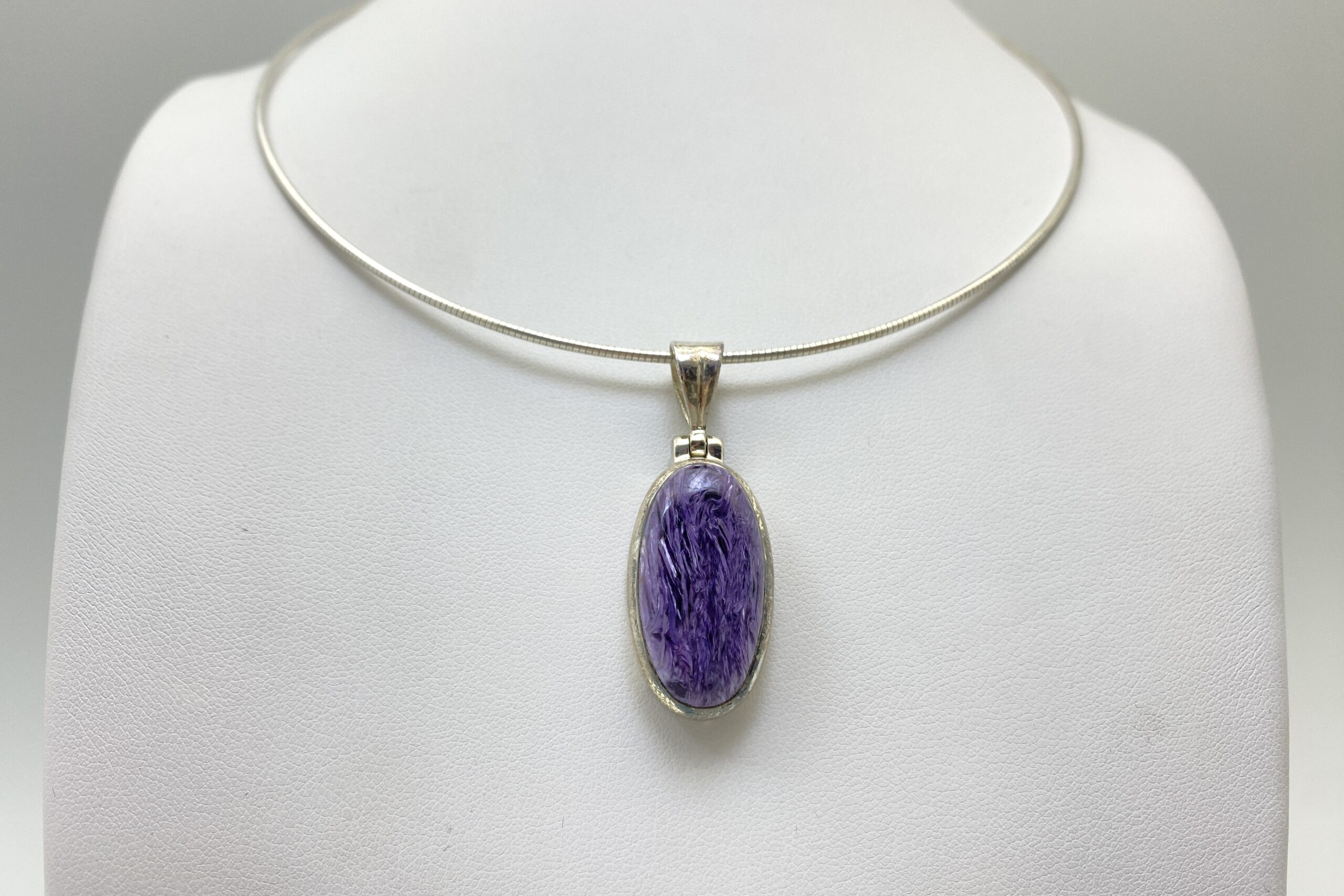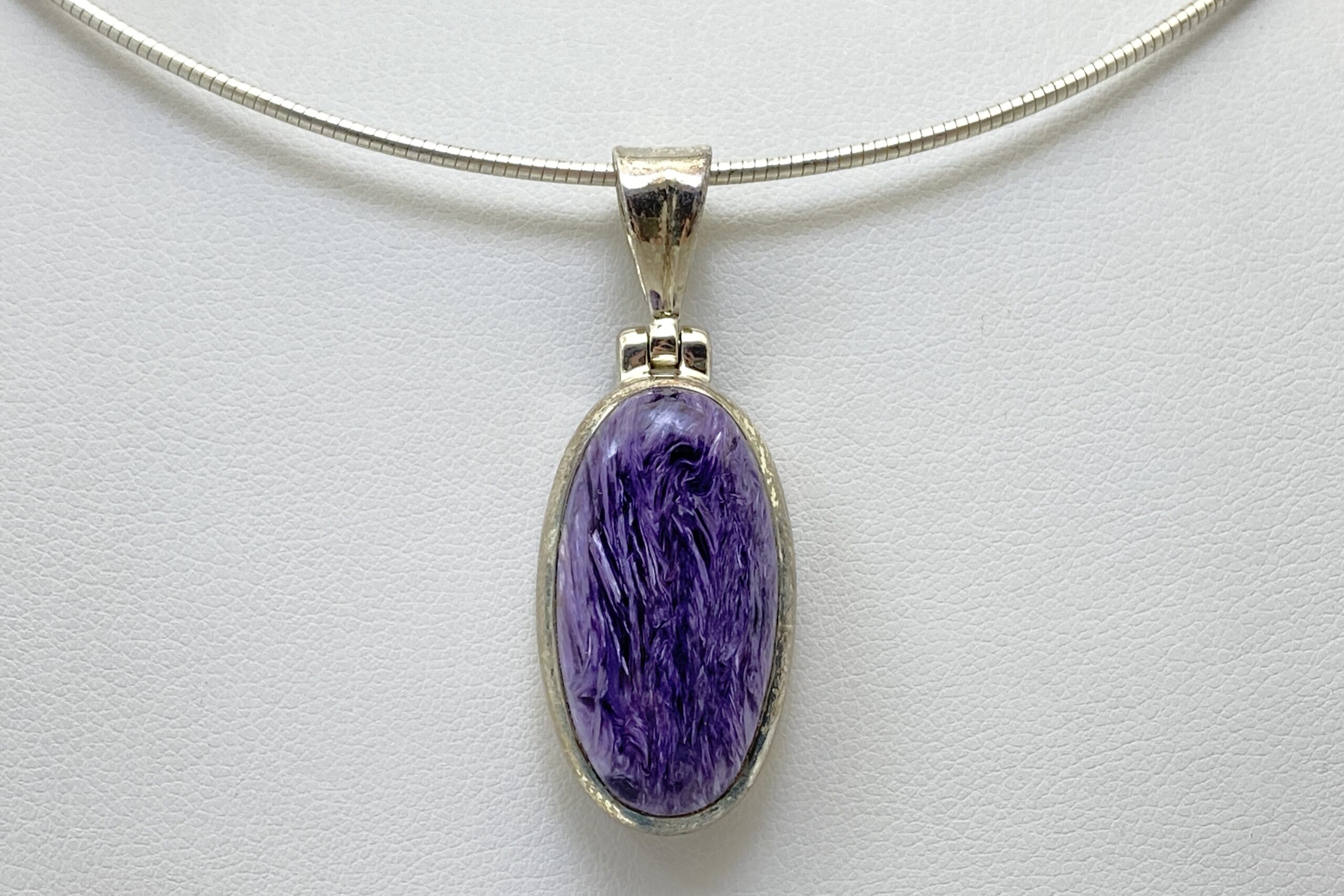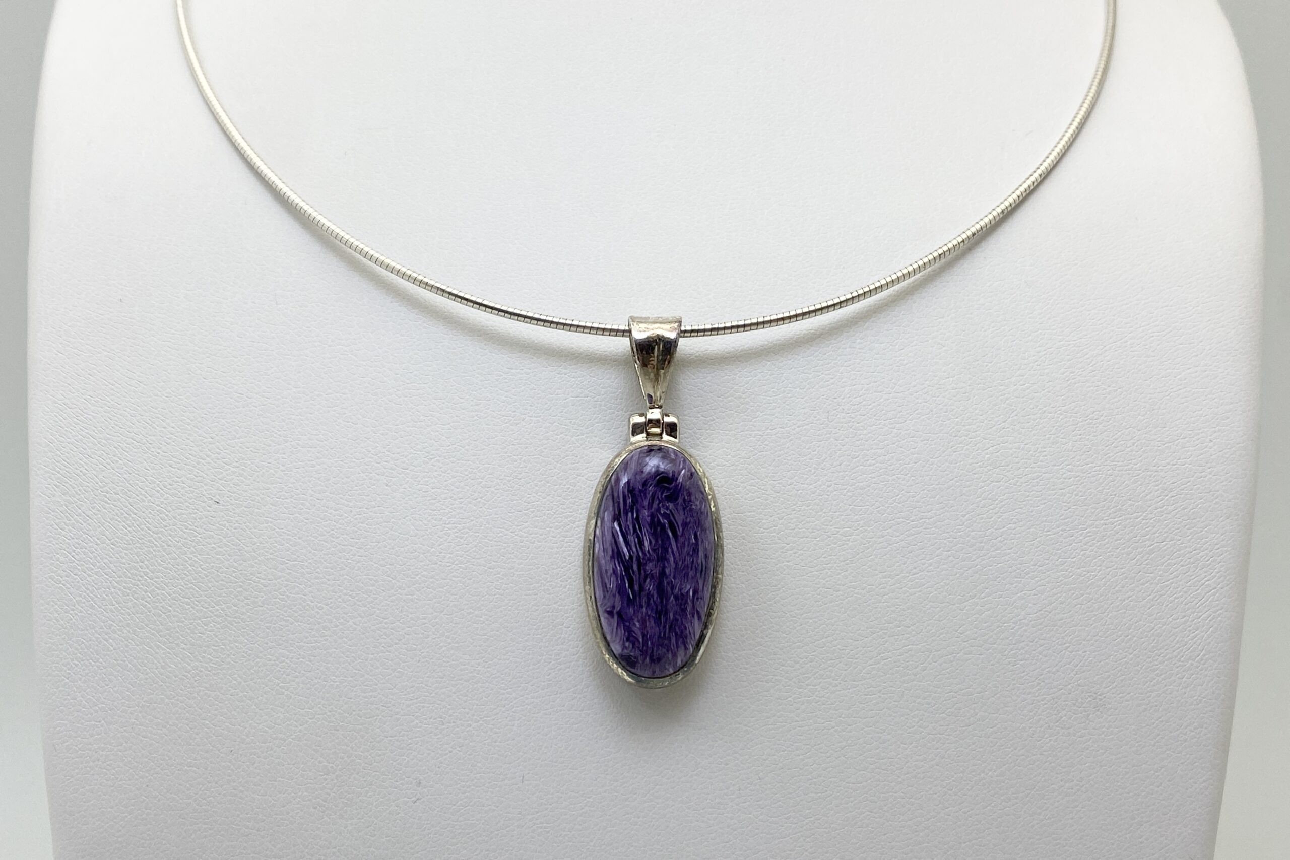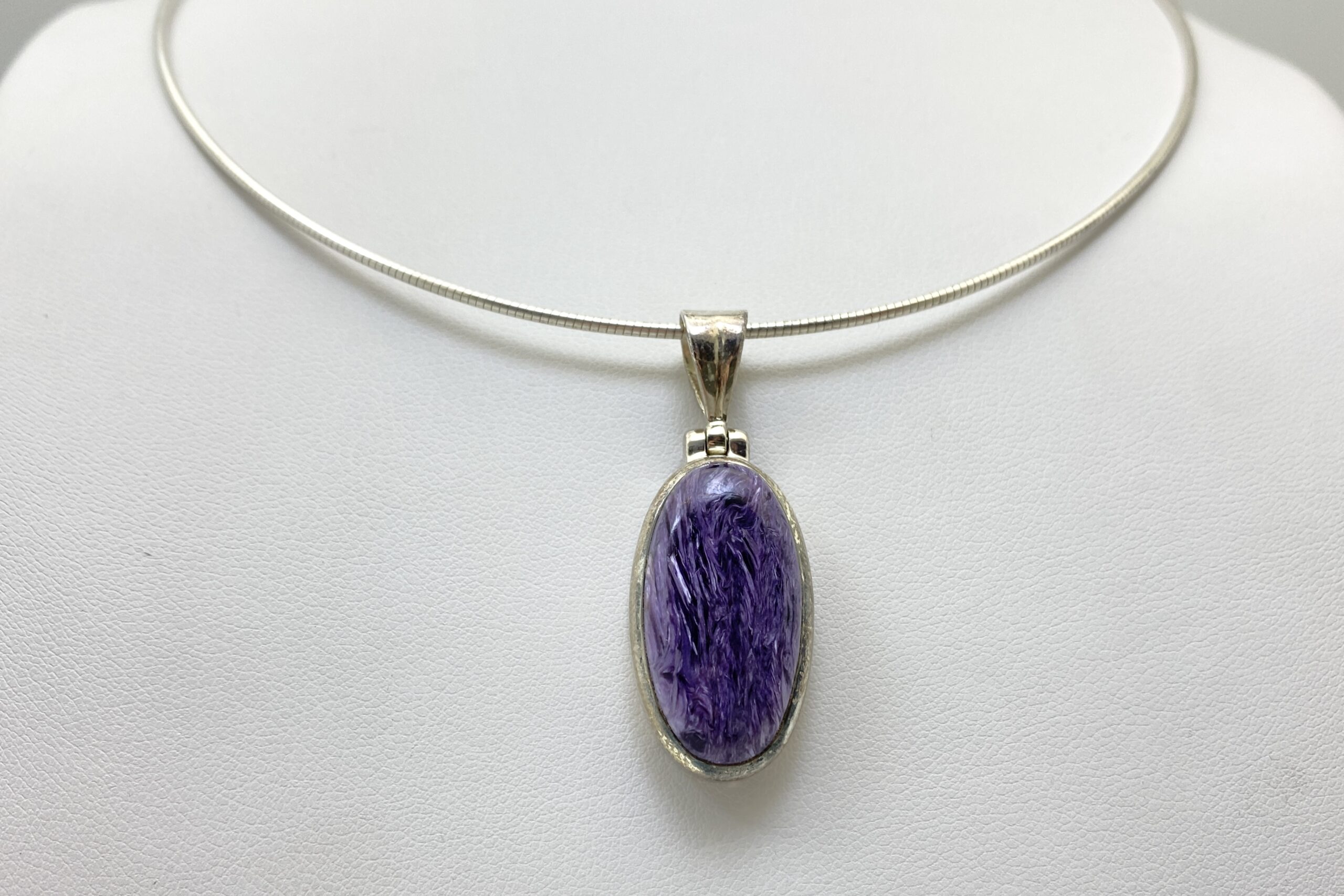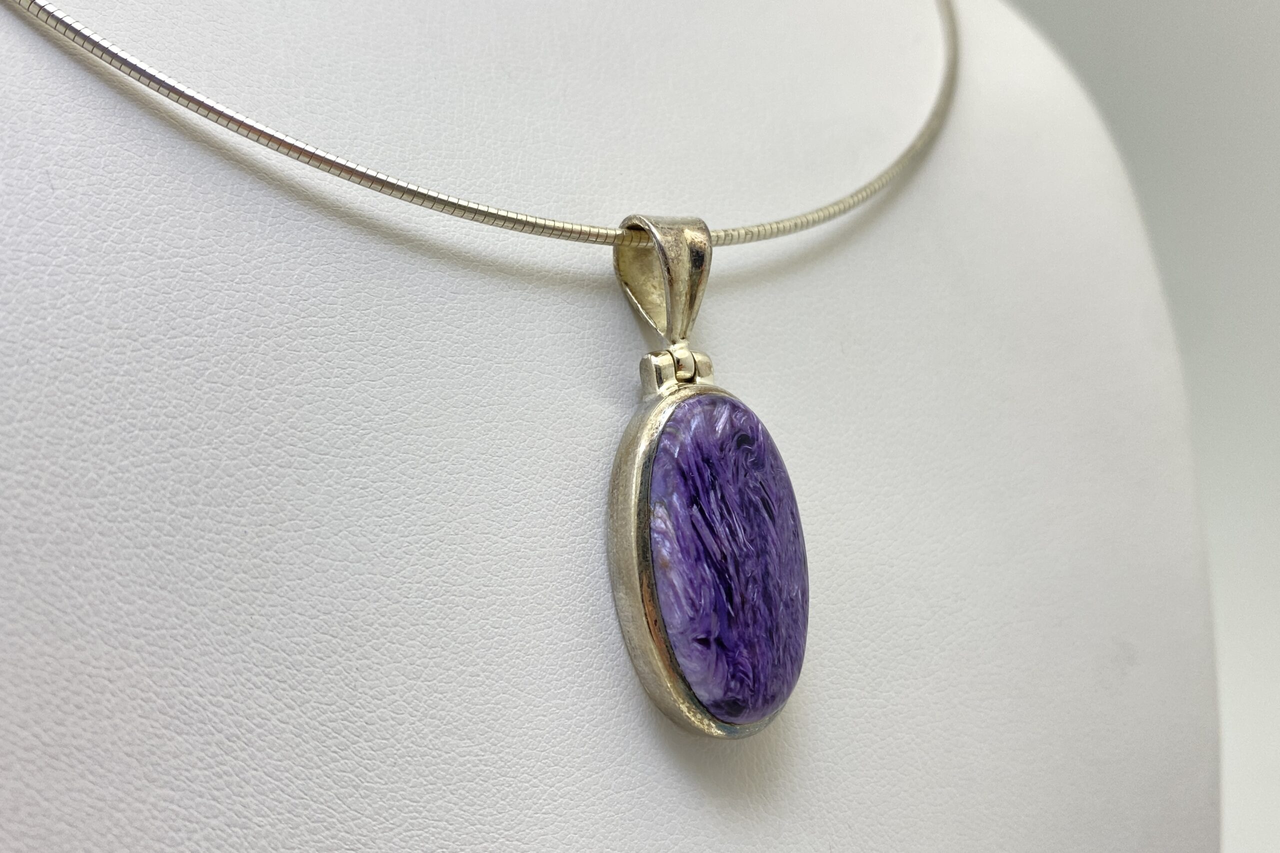 Nádherný unikátní přívěsek s oválným kabošonem překrásného čaroitu se zajímavou přírodní kresbou.
