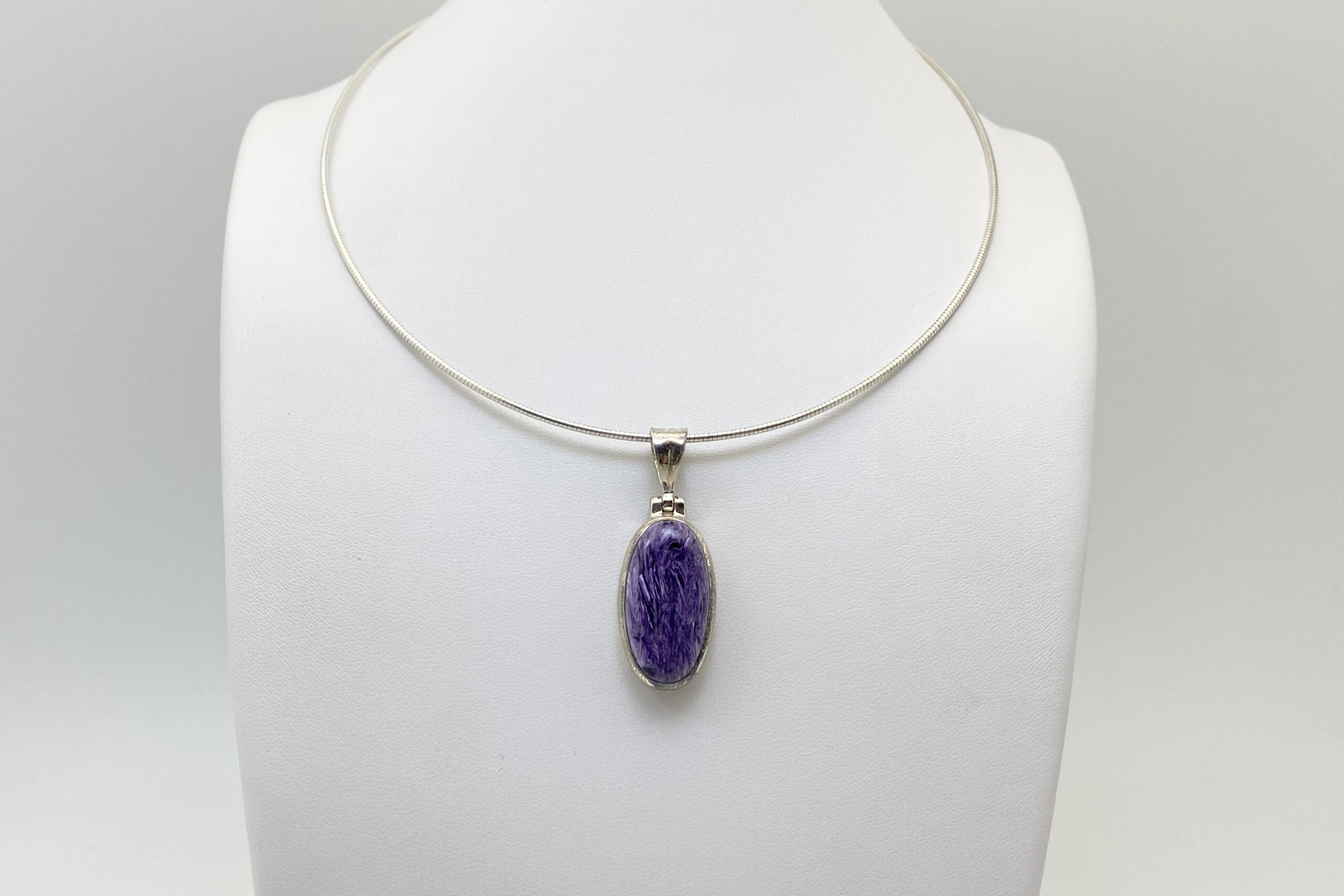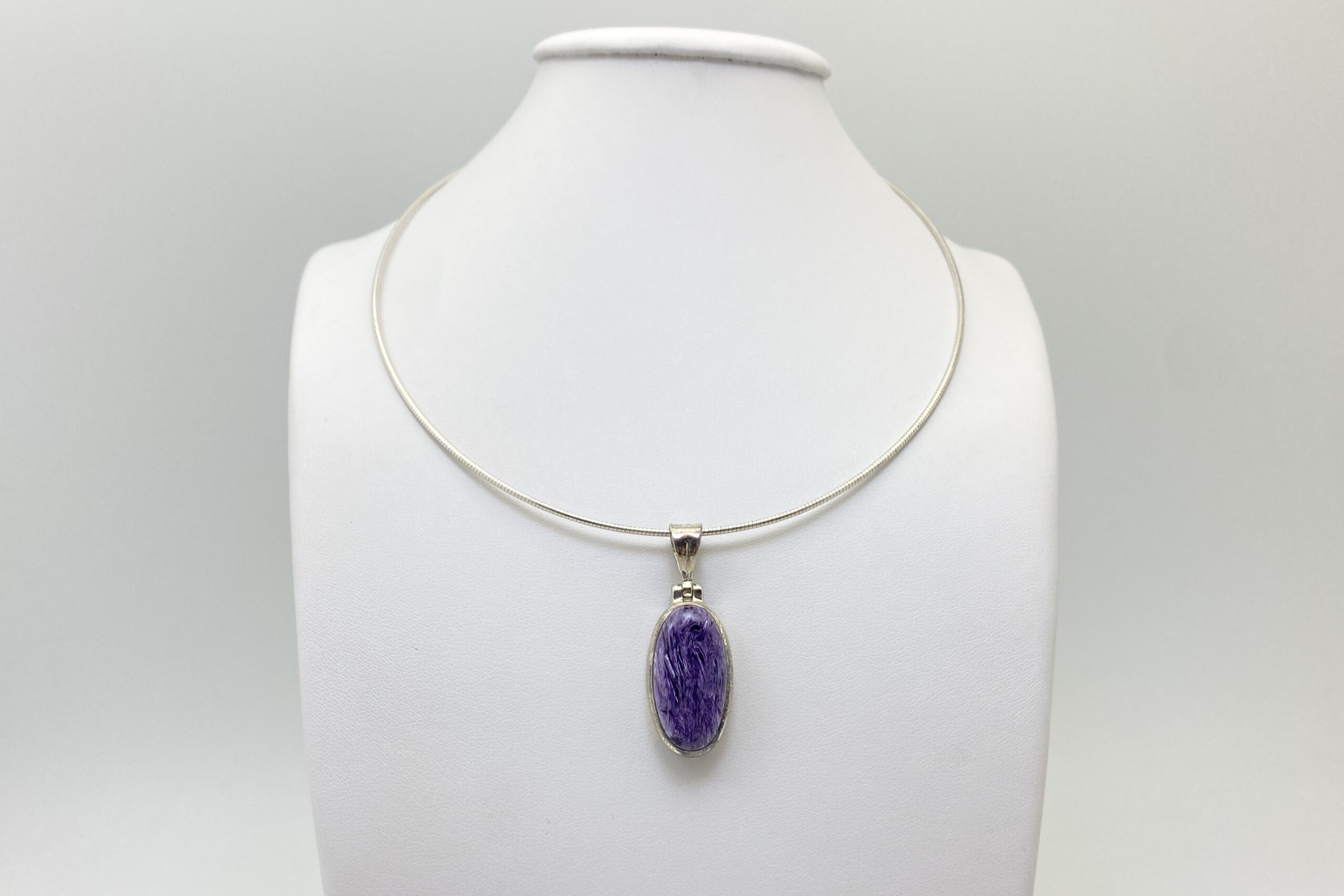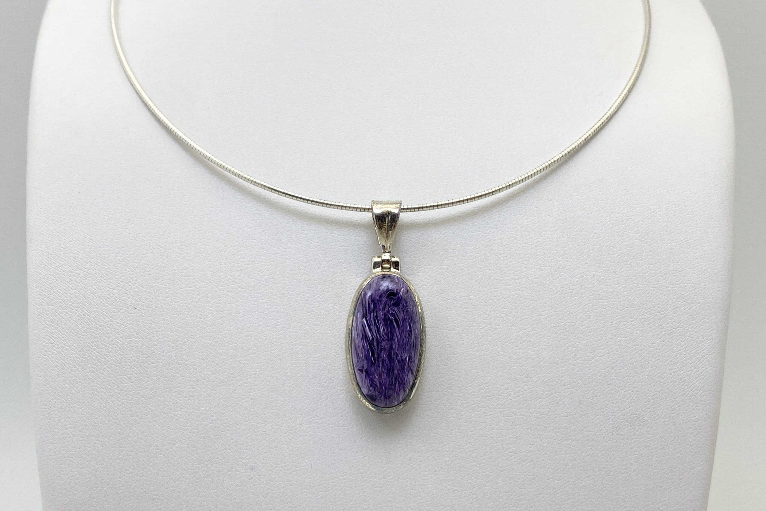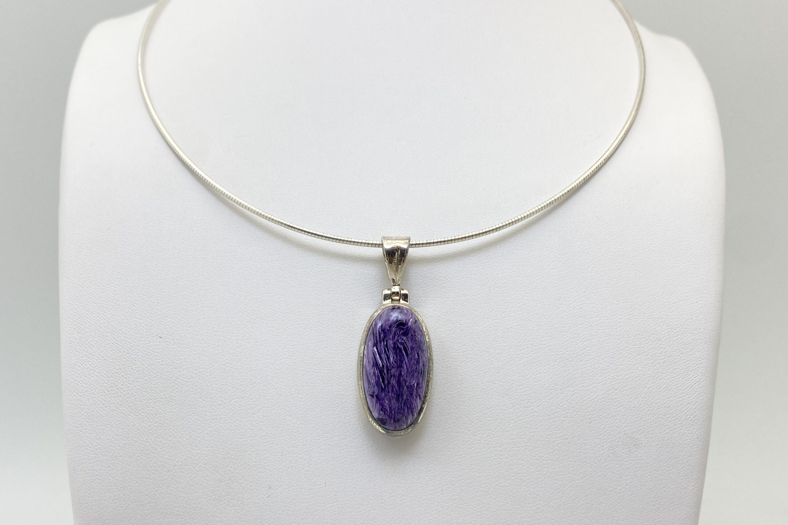 Nádherný unikátní přívěsek s oválným kabošonem překrásného čaroitu se zajímavou přírodní kresbou.