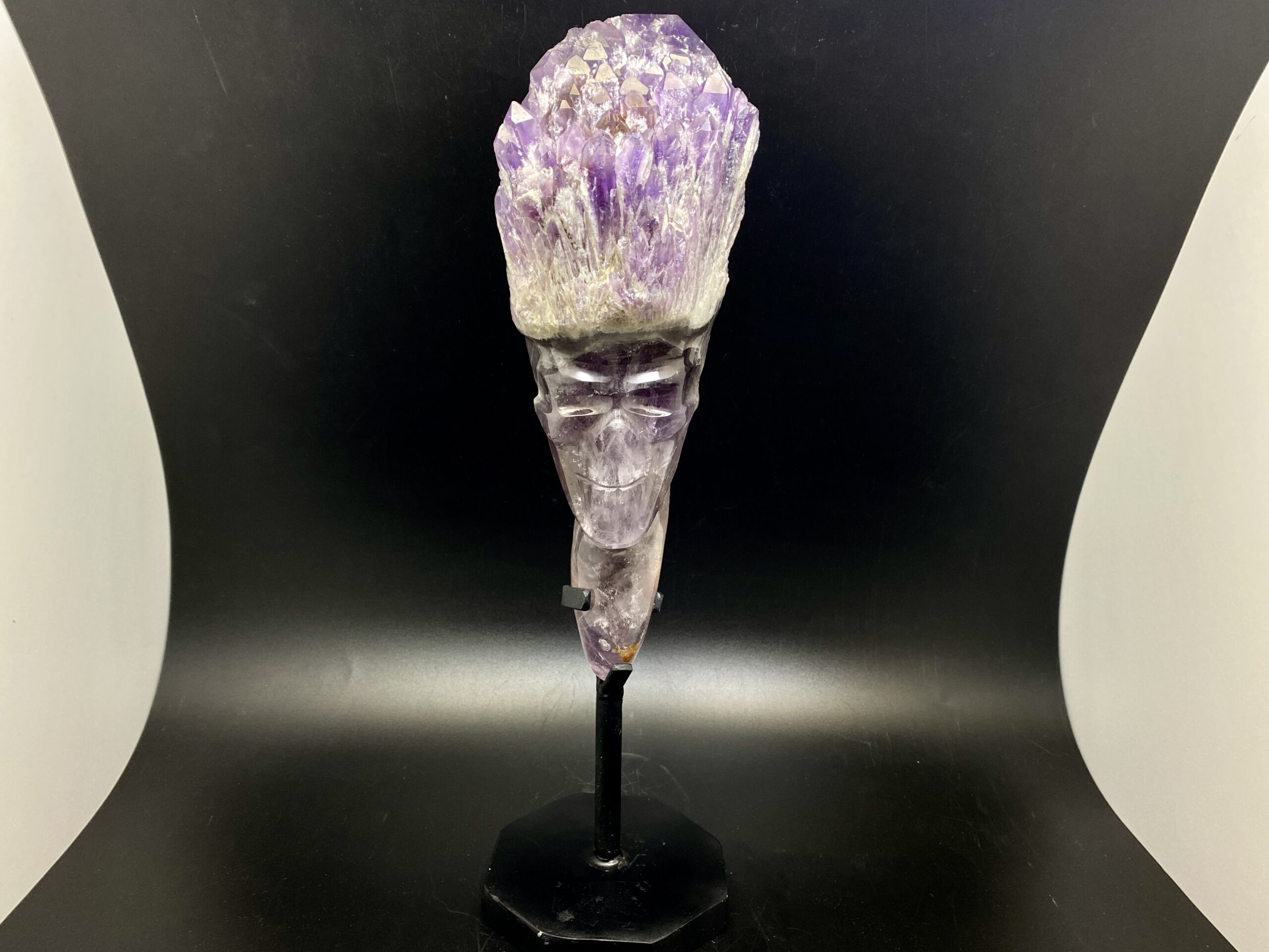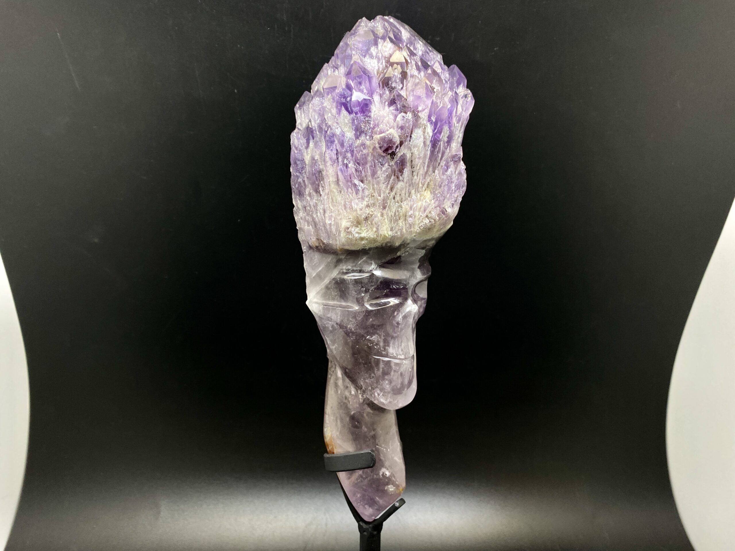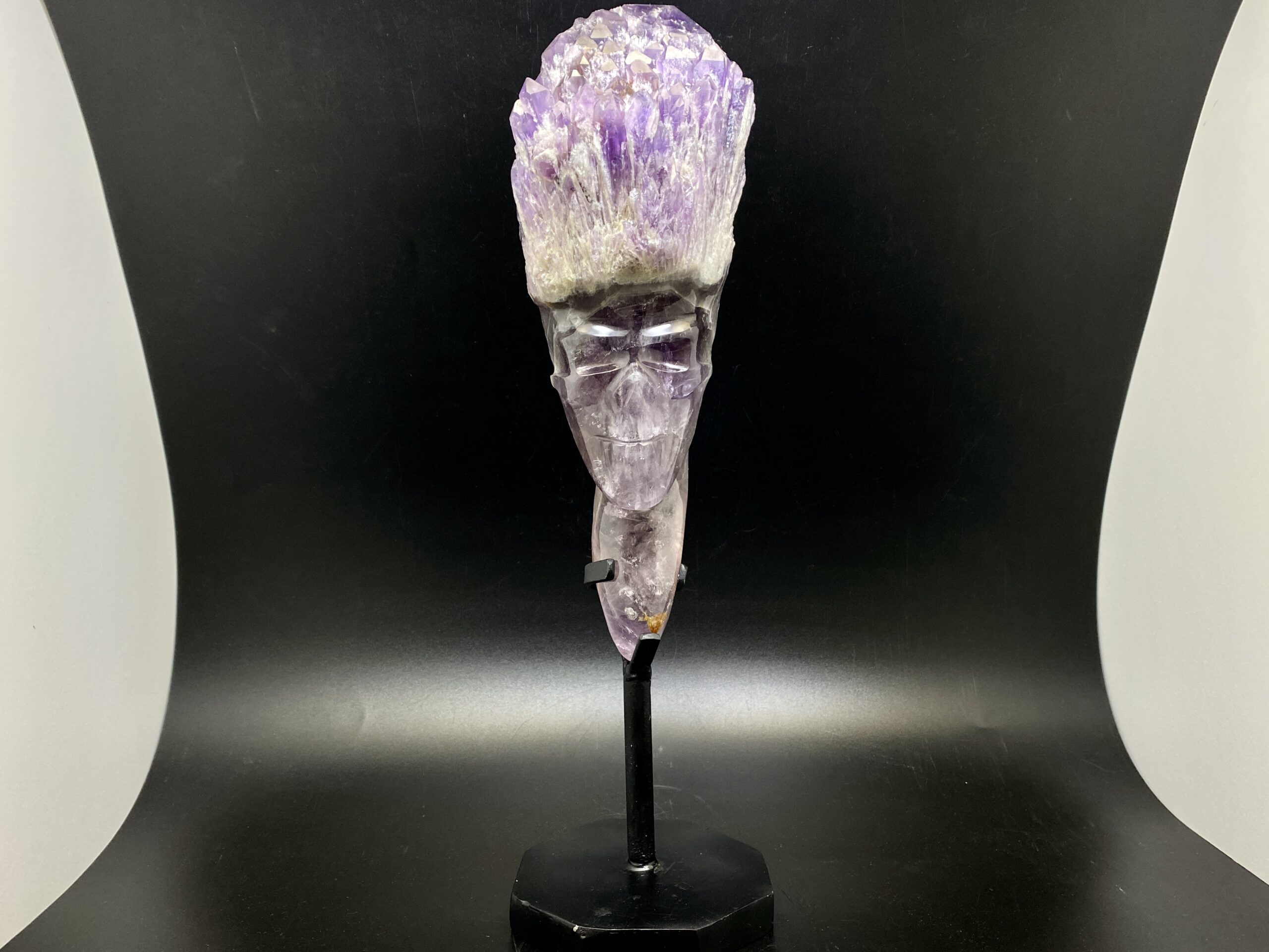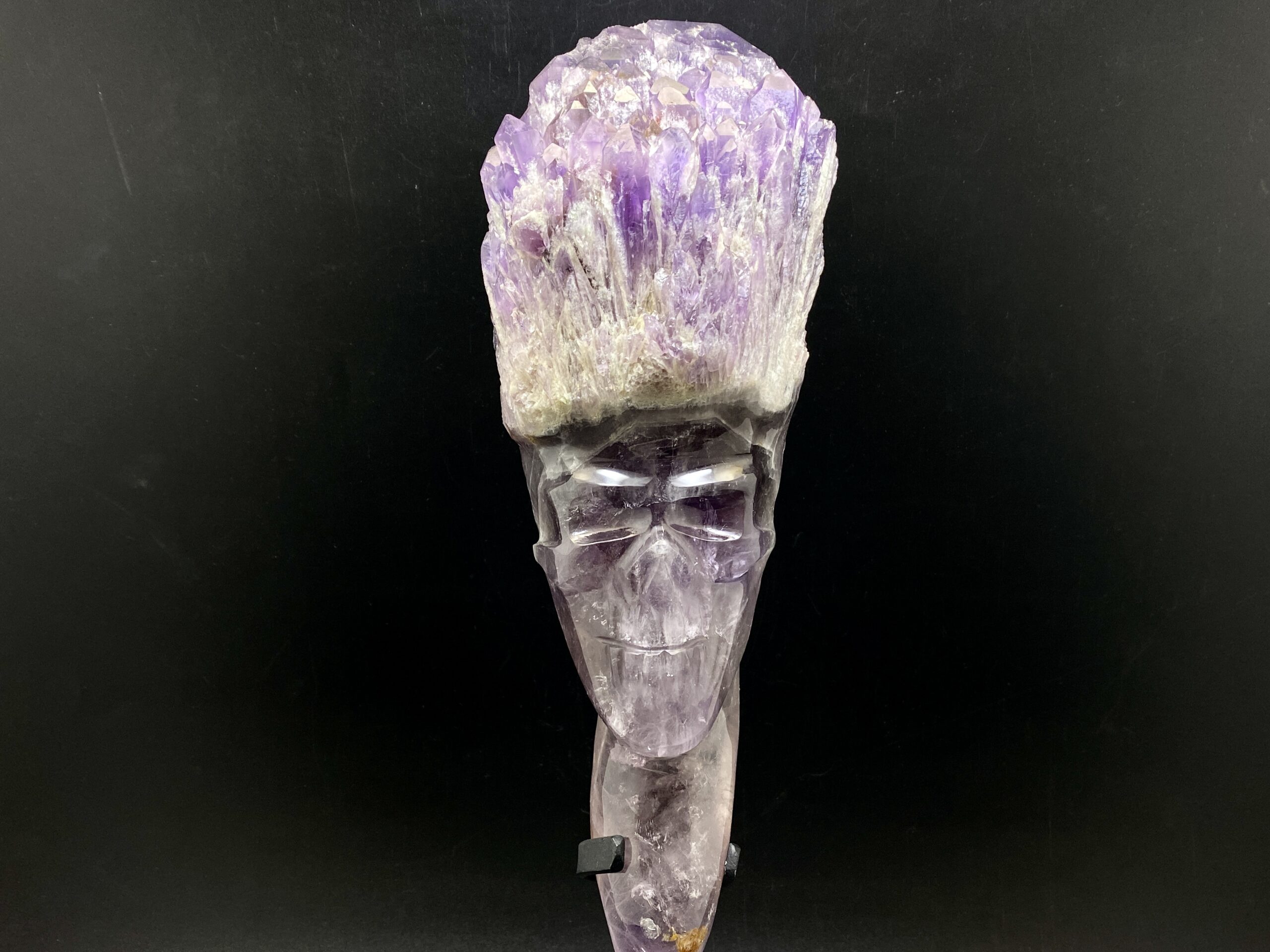 Úžasná ametystová lebka s přírodními krystaly jako indiánskou čelenkou, vhodná k dekoraci interiéru. Originální kovový stojánek je součástí produktu.