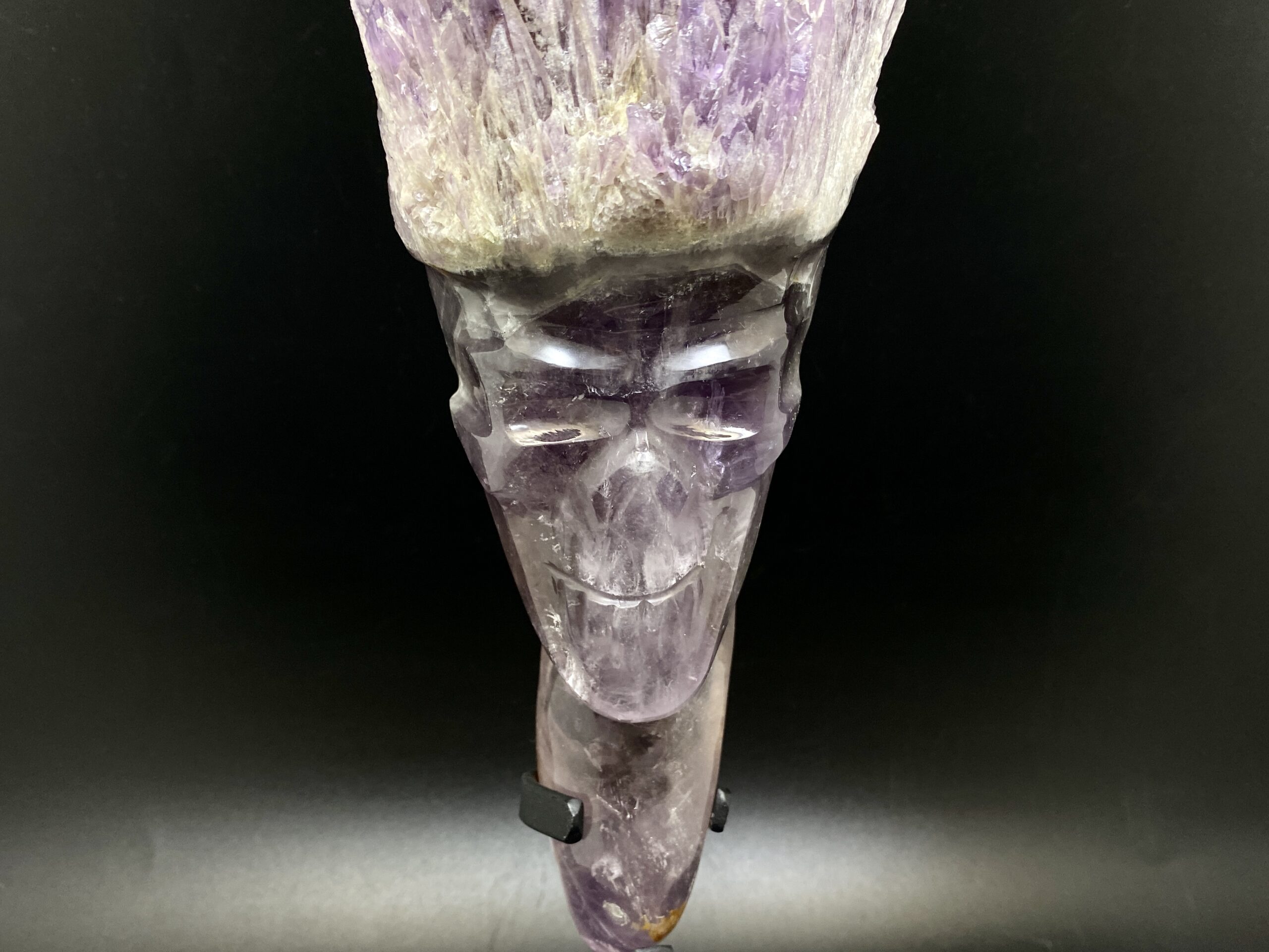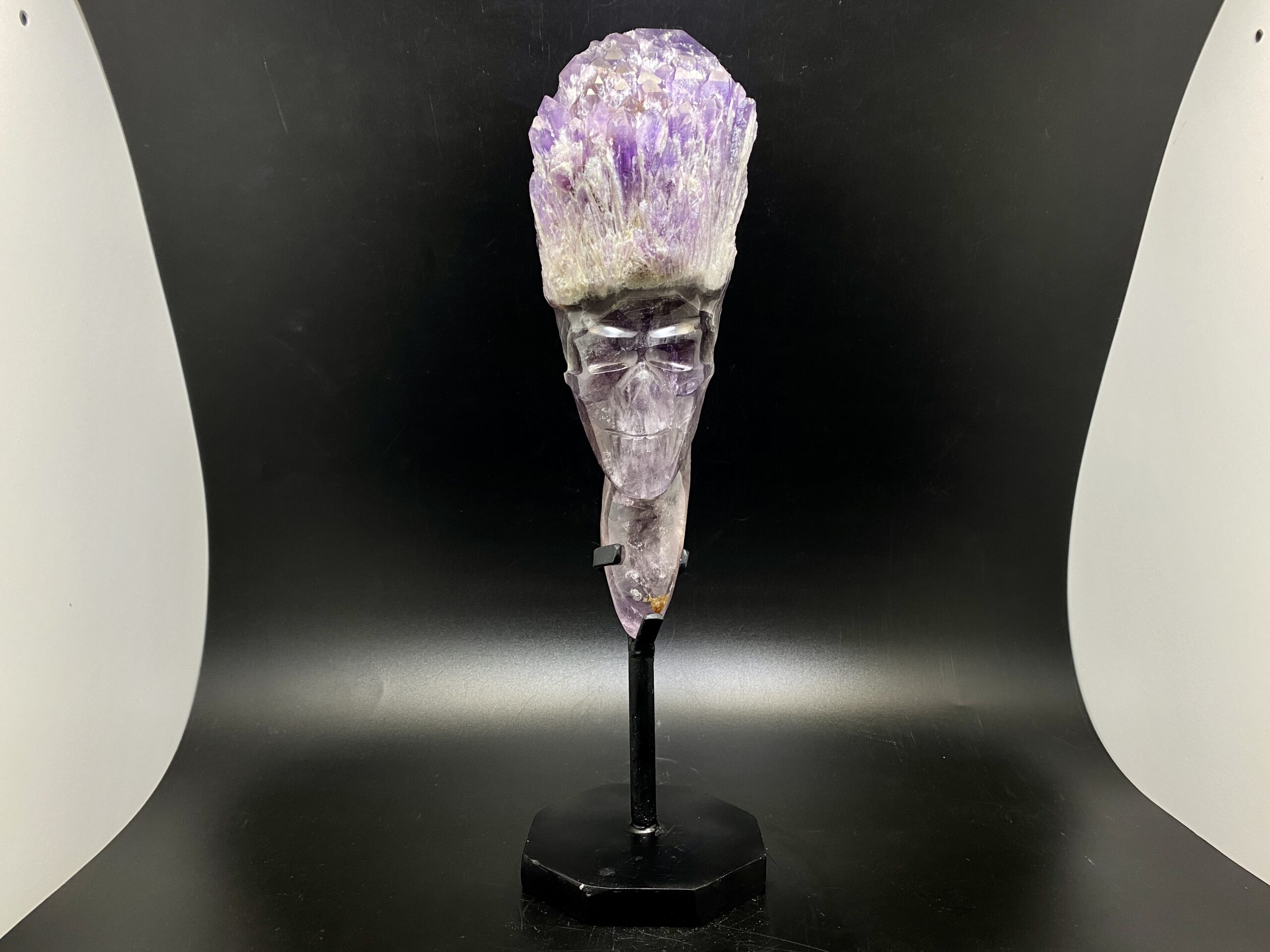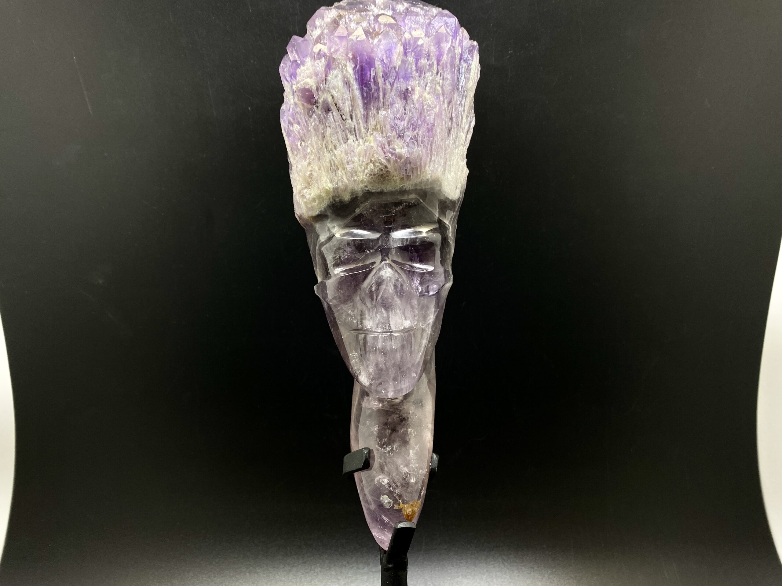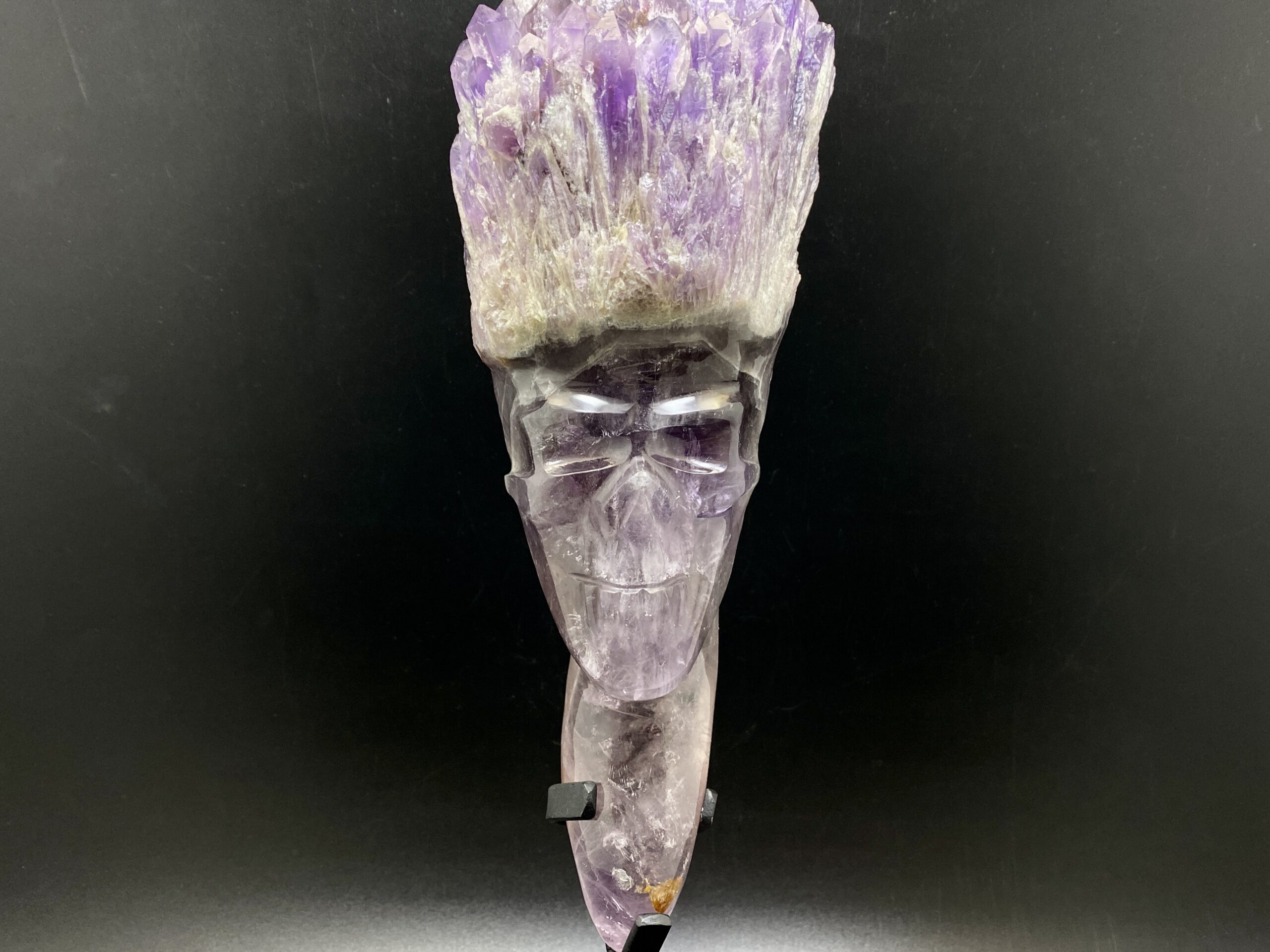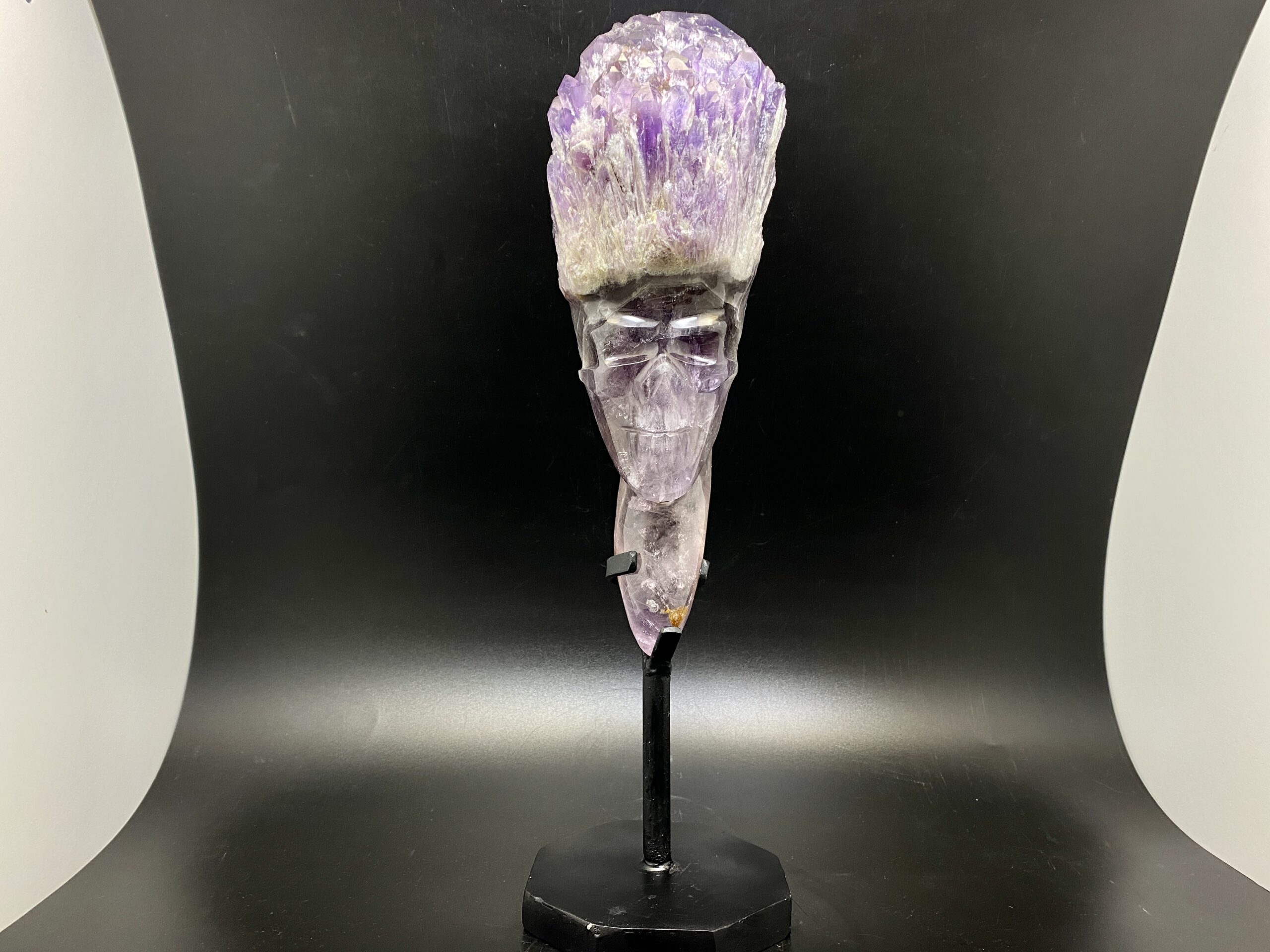 Úžasná ametystová lebka s přírodními krystaly jako indiánskou čelenkou, vhodná k dekoraci interiéru. Originální kovový stojánek je součástí produktu.