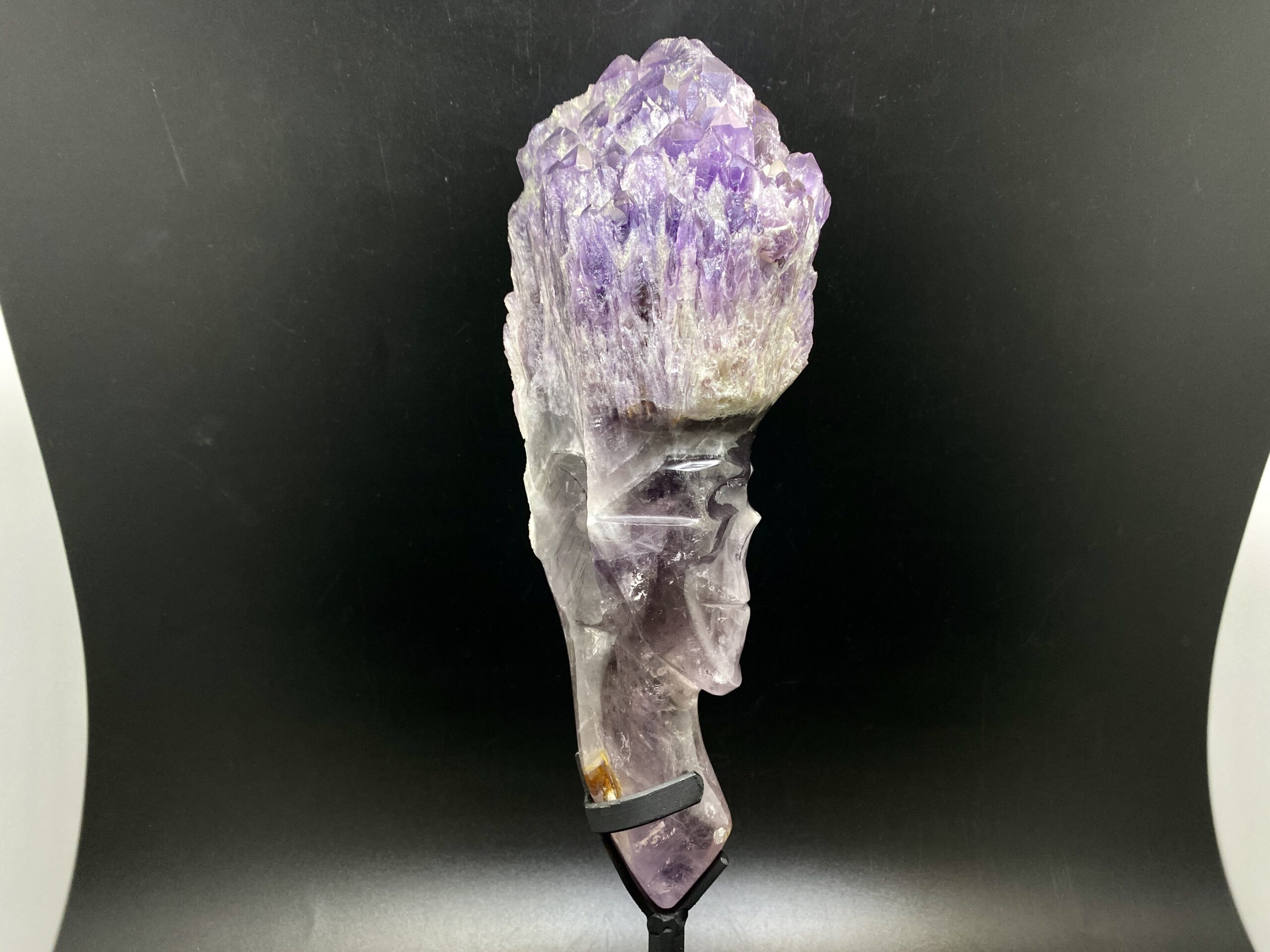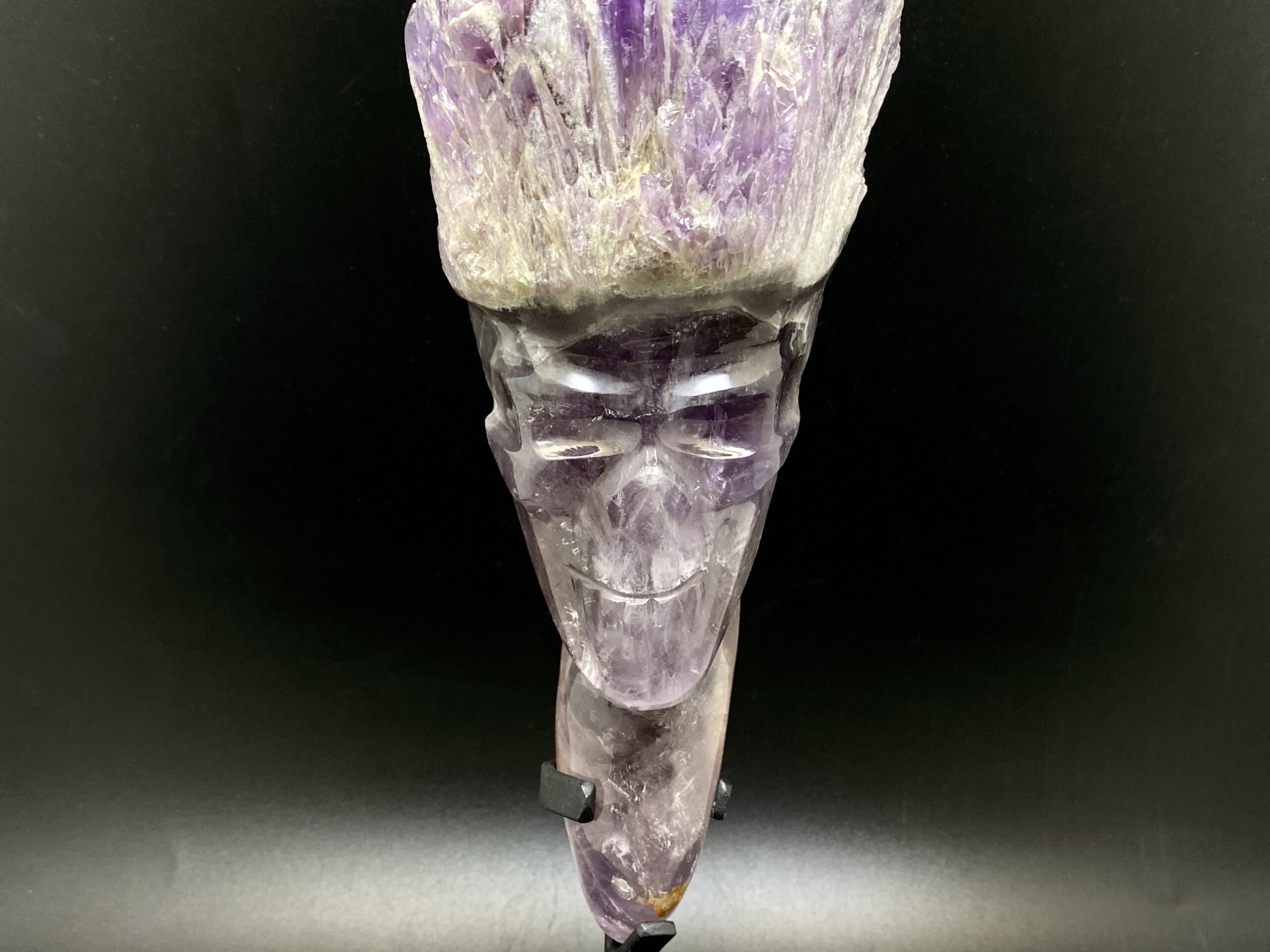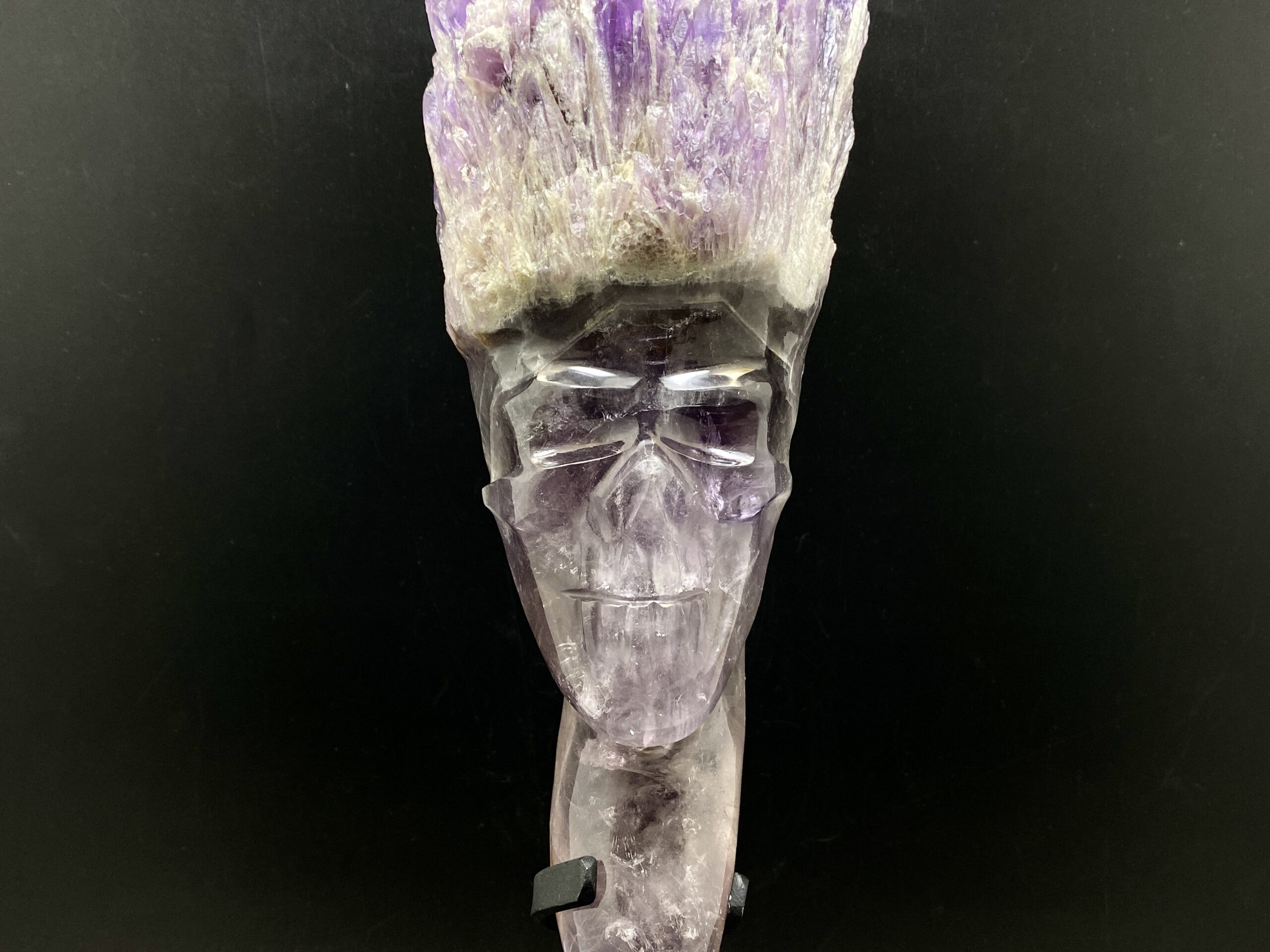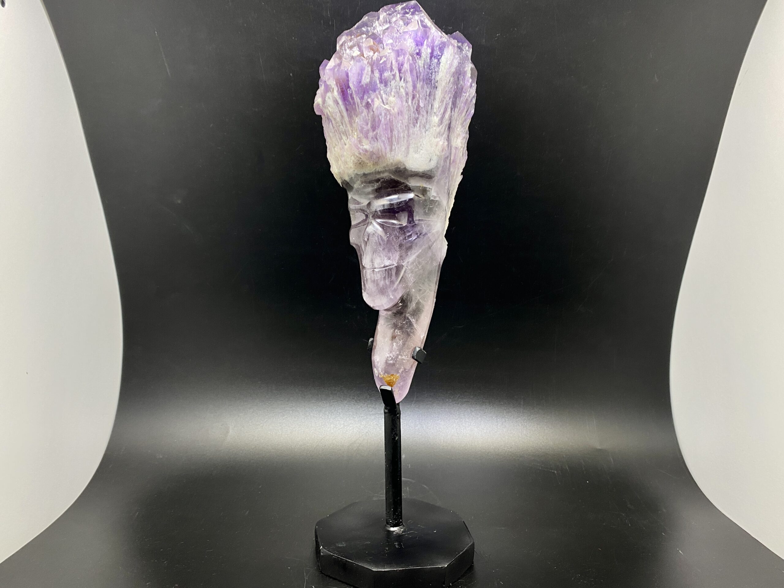 Úžasná ametystová lebka s přírodními krystaly jako indiánskou čelenkou, vhodná k dekoraci interiéru. Originální kovový stojánek je součástí produktu.