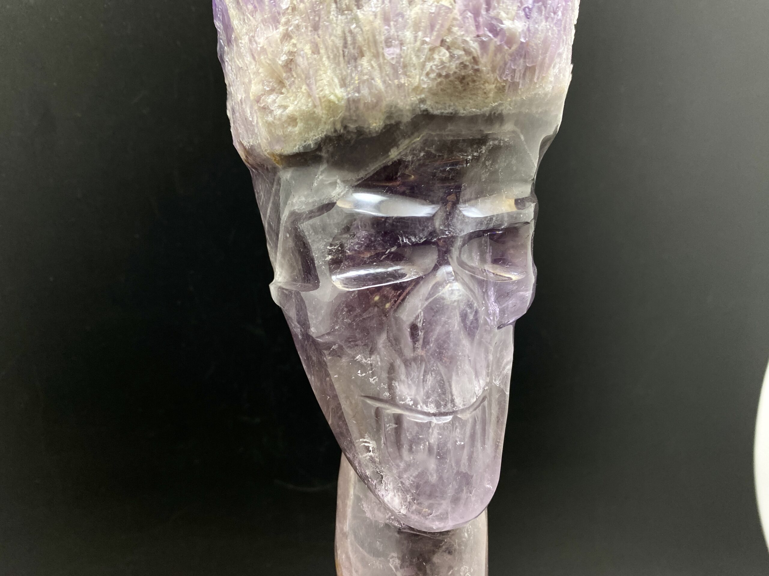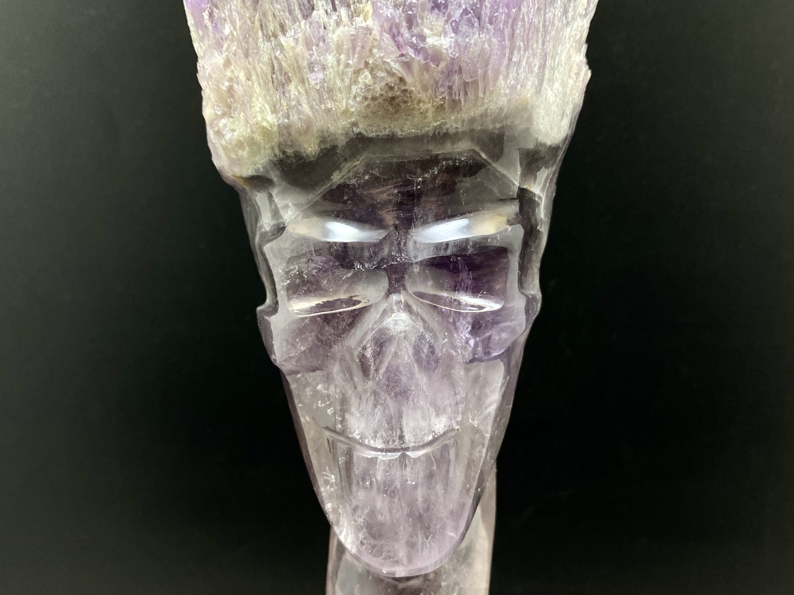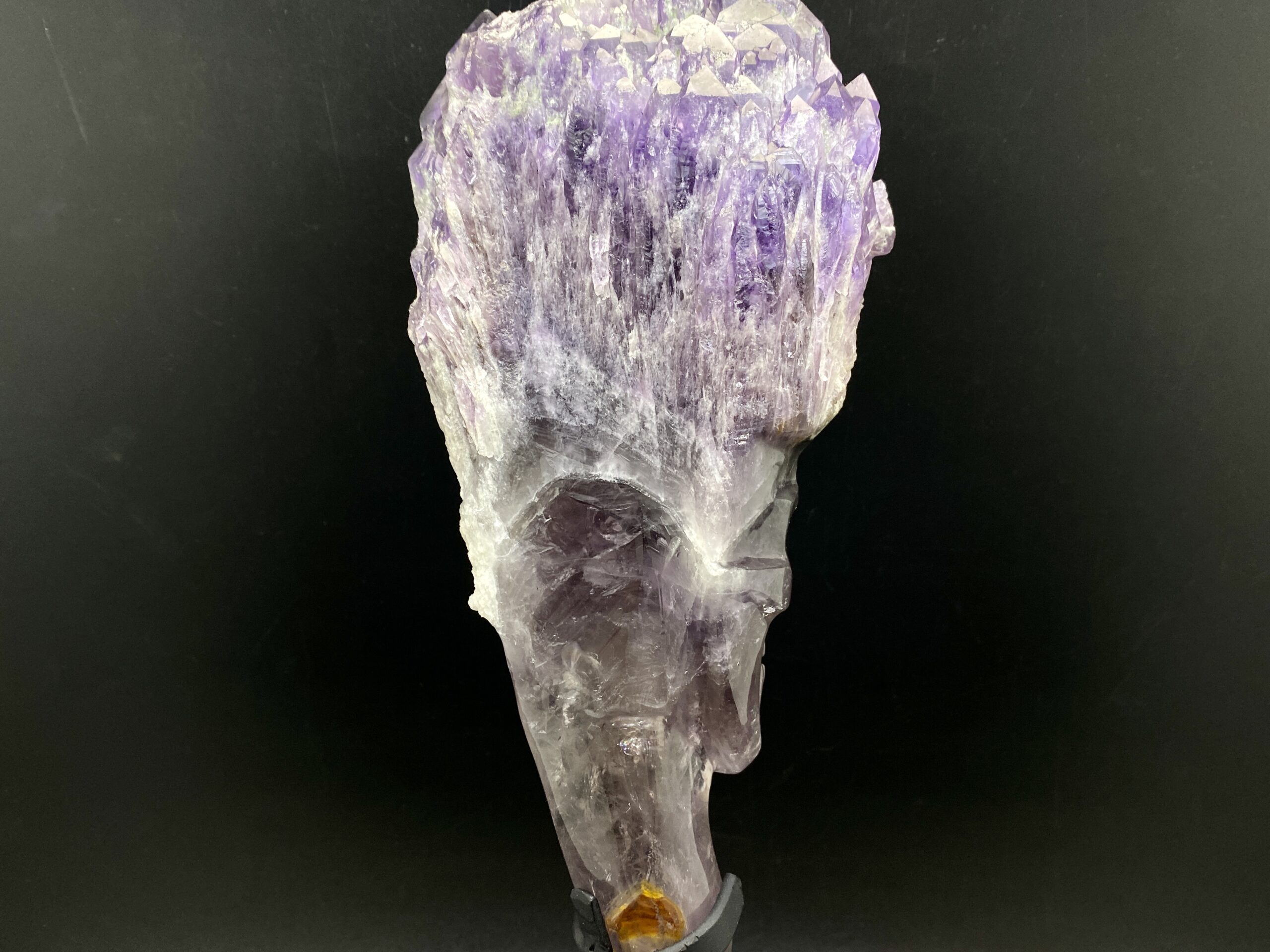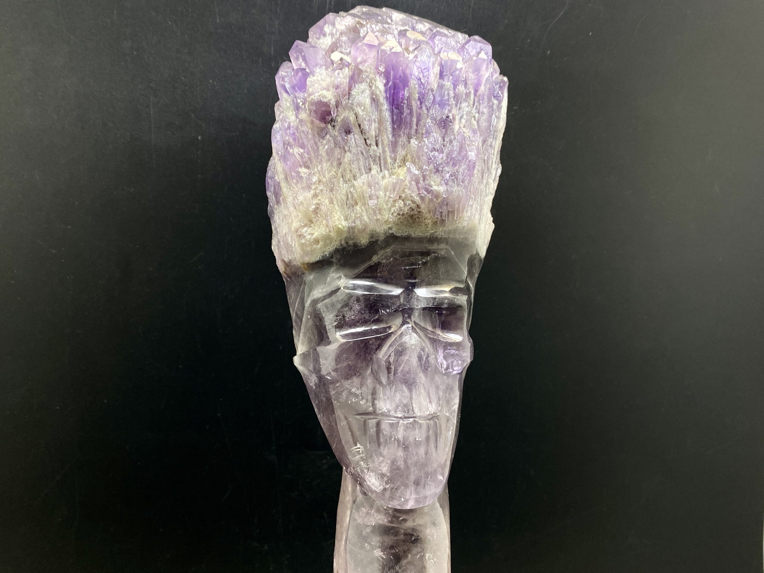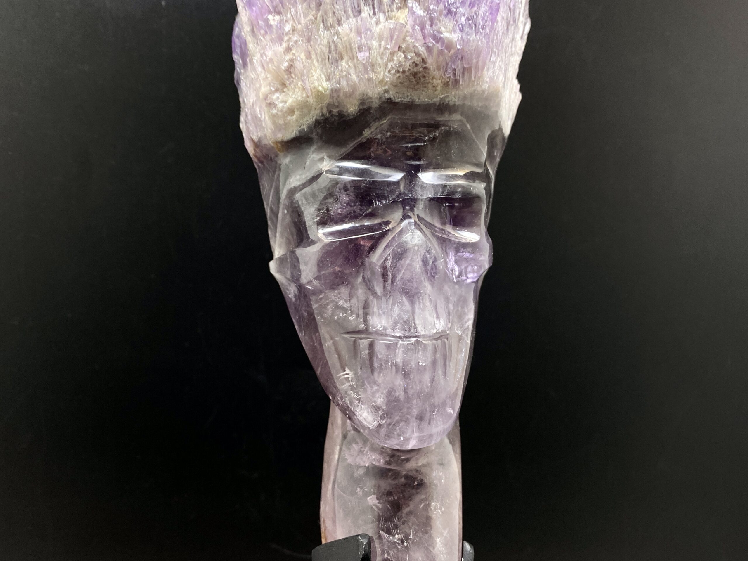 Úžasná ametystová lebka s přírodními krystaly jako indiánskou čelenkou, vhodná k dekoraci interiéru. Originální kovový stojánek je součástí produktu.
