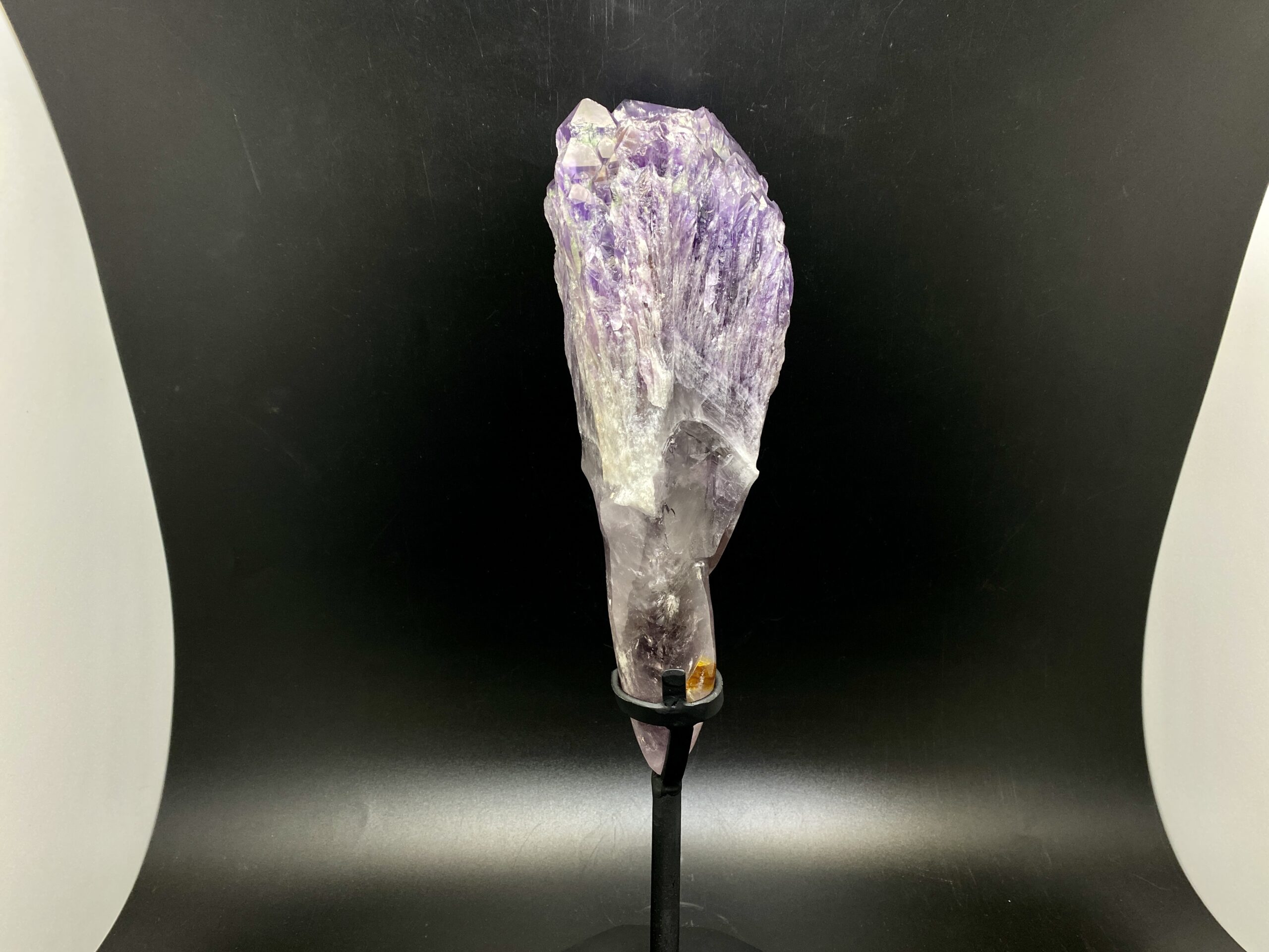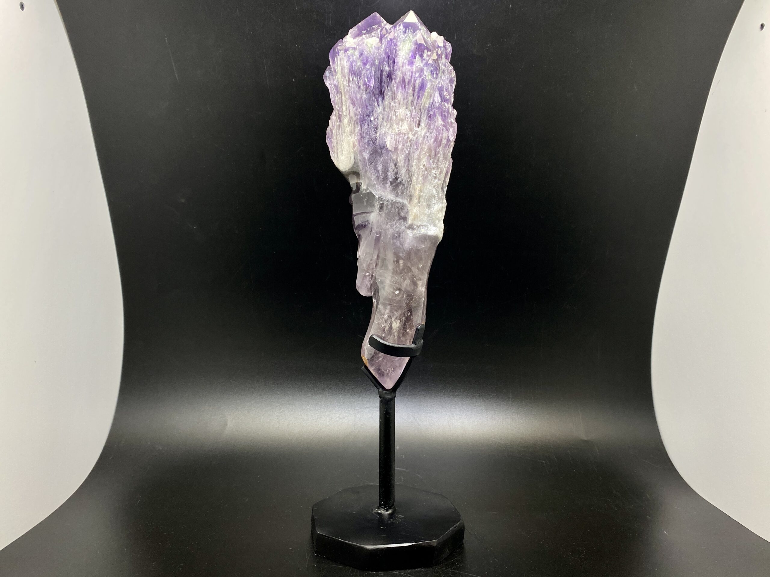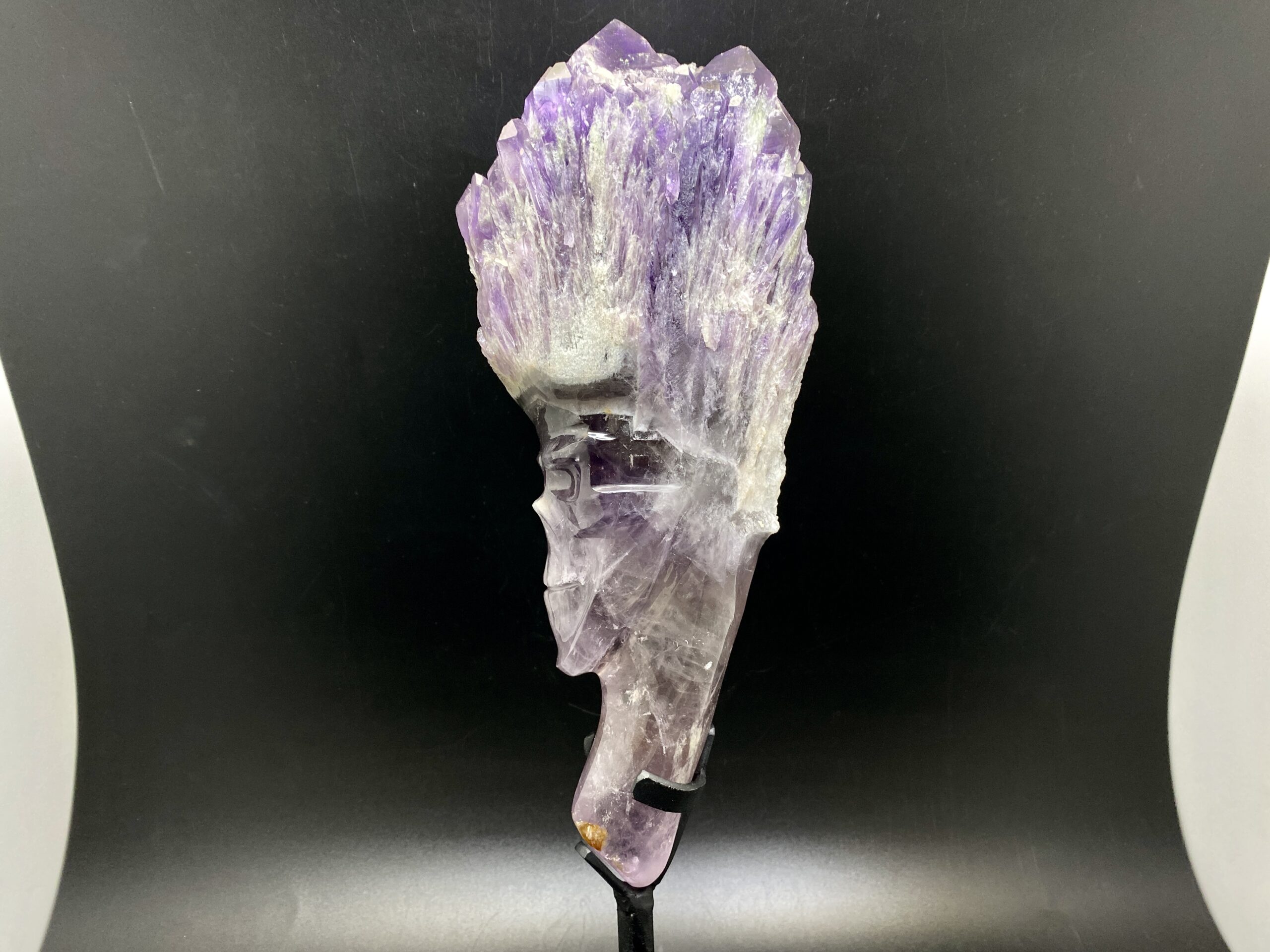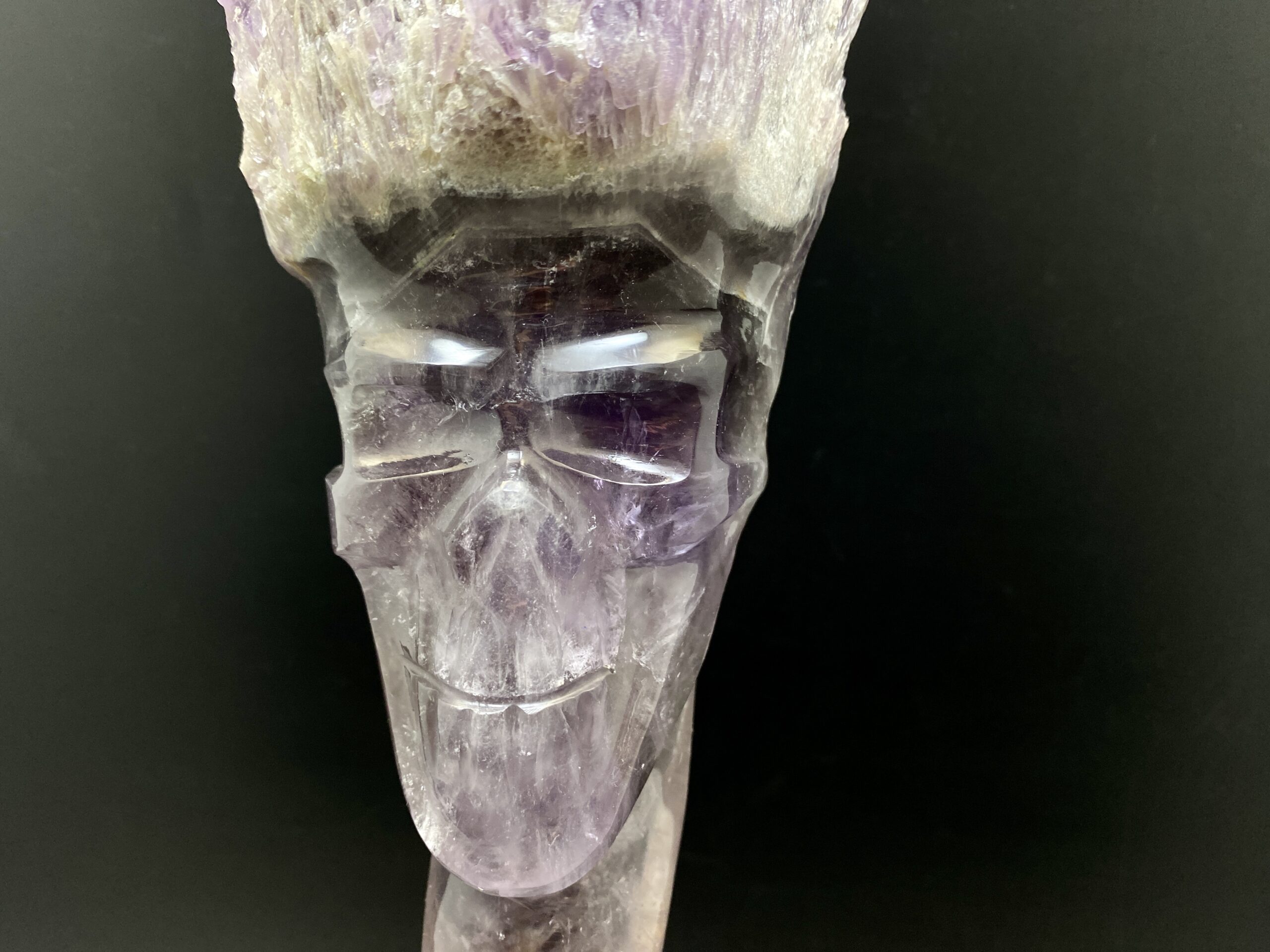 Úžasná ametystová lebka s přírodními krystaly jako indiánskou čelenkou, vhodná k dekoraci interiéru. Originální kovový stojánek je součástí produktu.