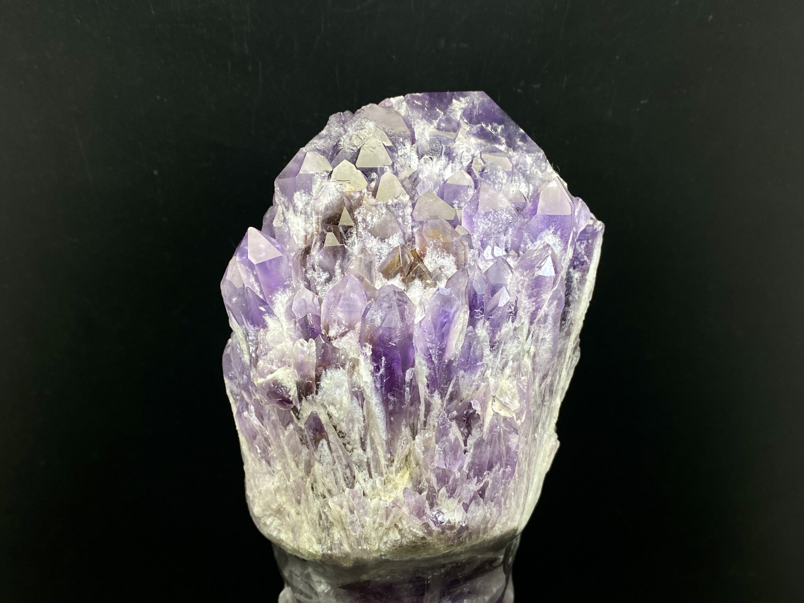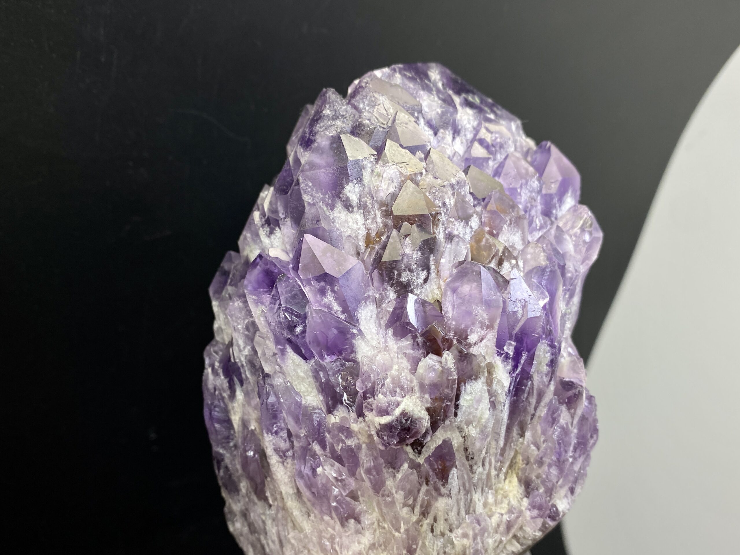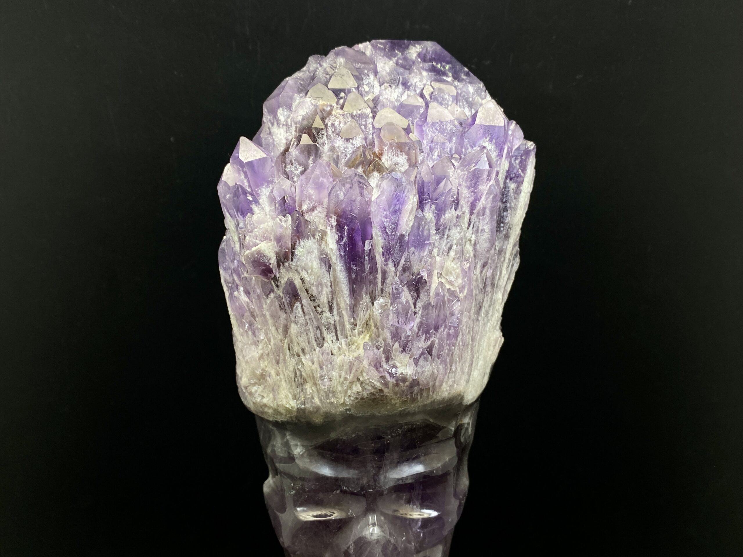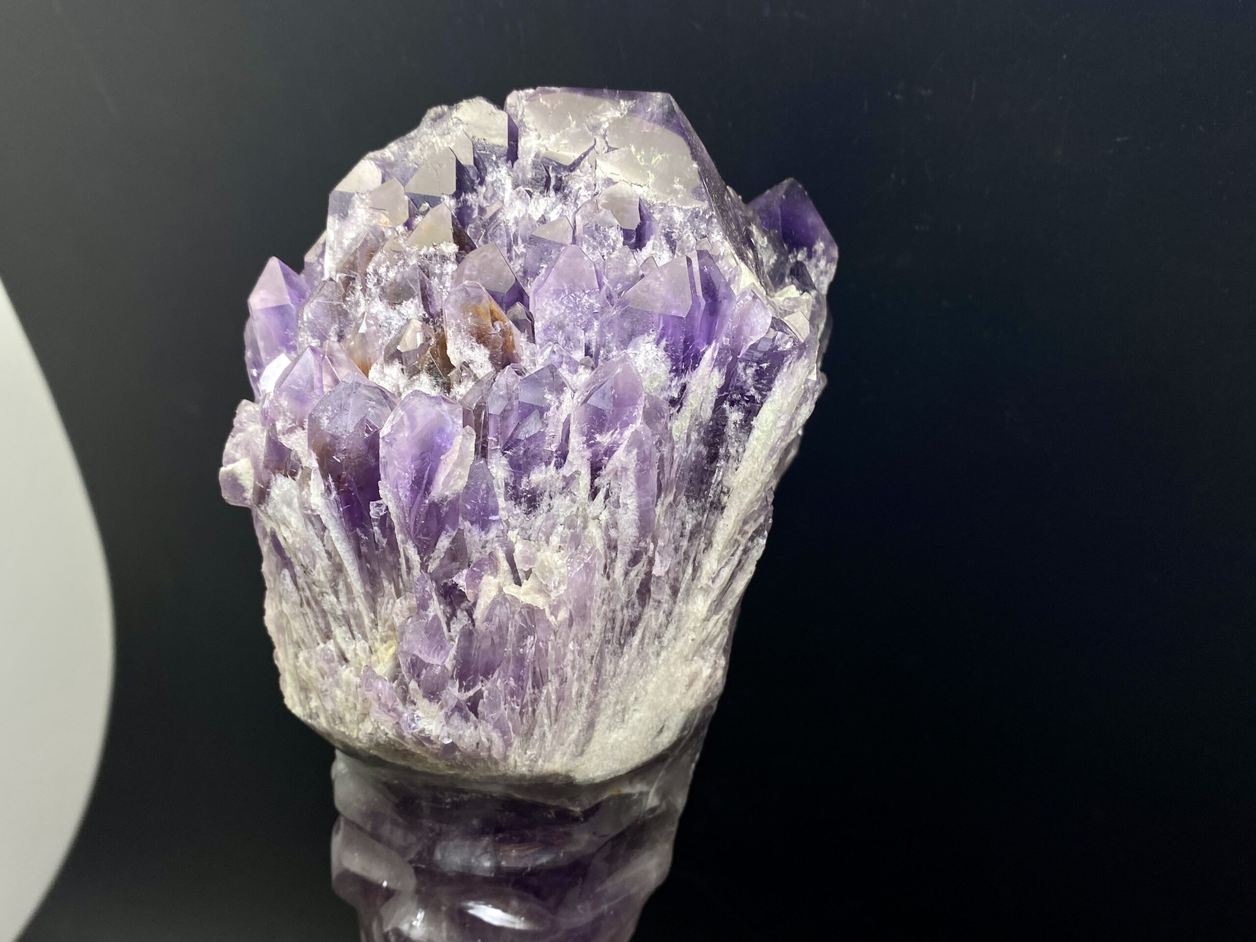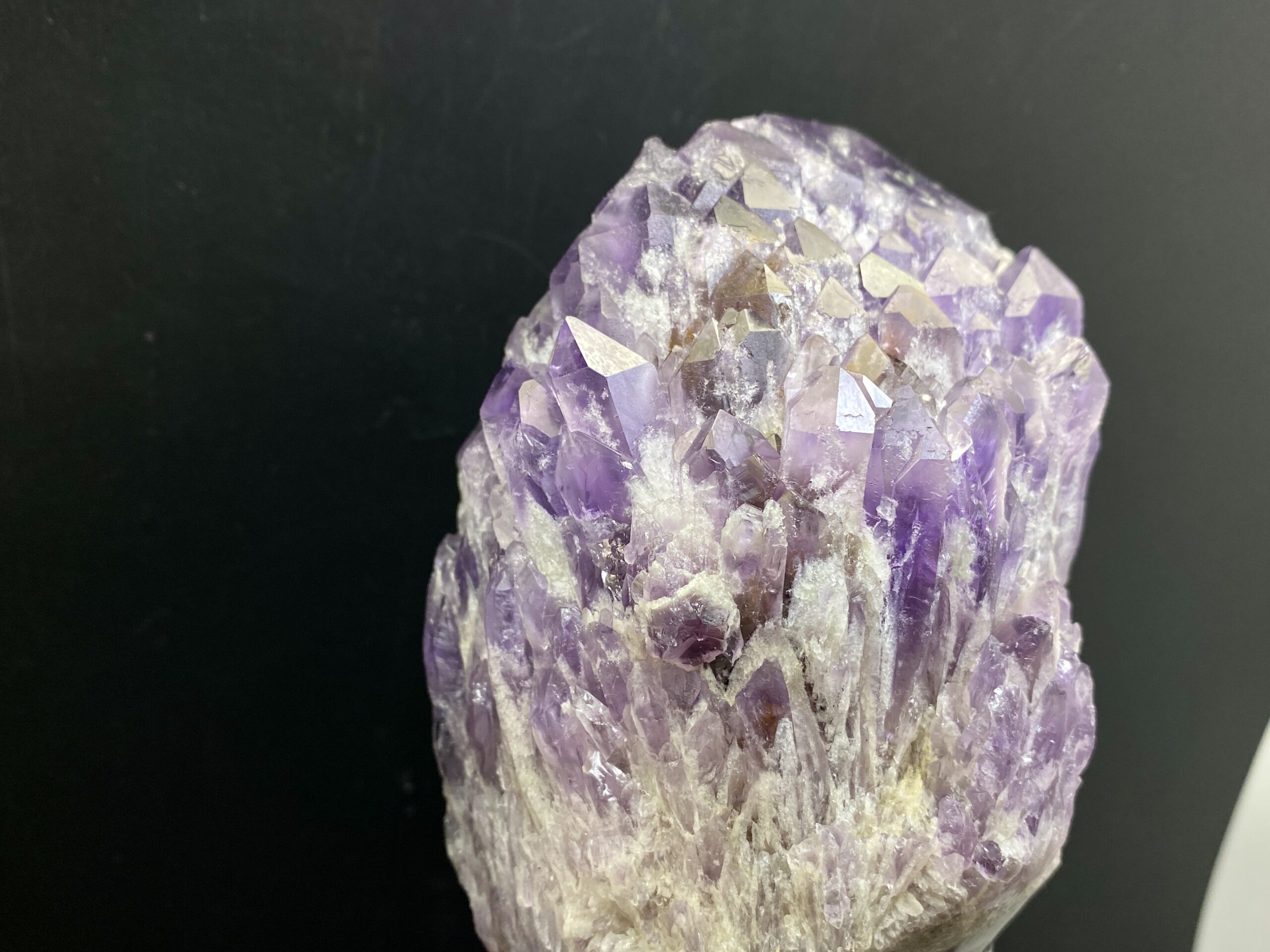 Úžasná ametystová lebka s přírodními krystaly jako indiánskou čelenkou, vhodná k dekoraci interiéru. Originální kovový stojánek je součástí produktu.