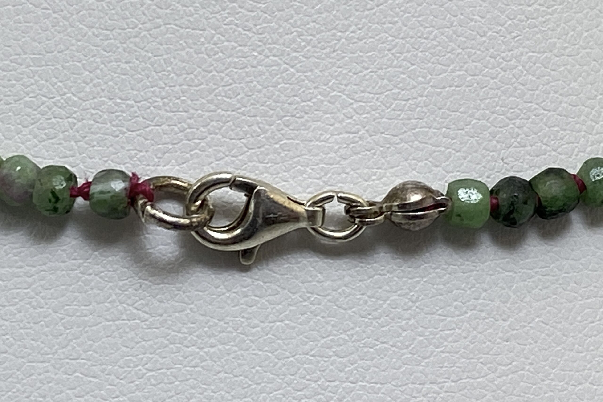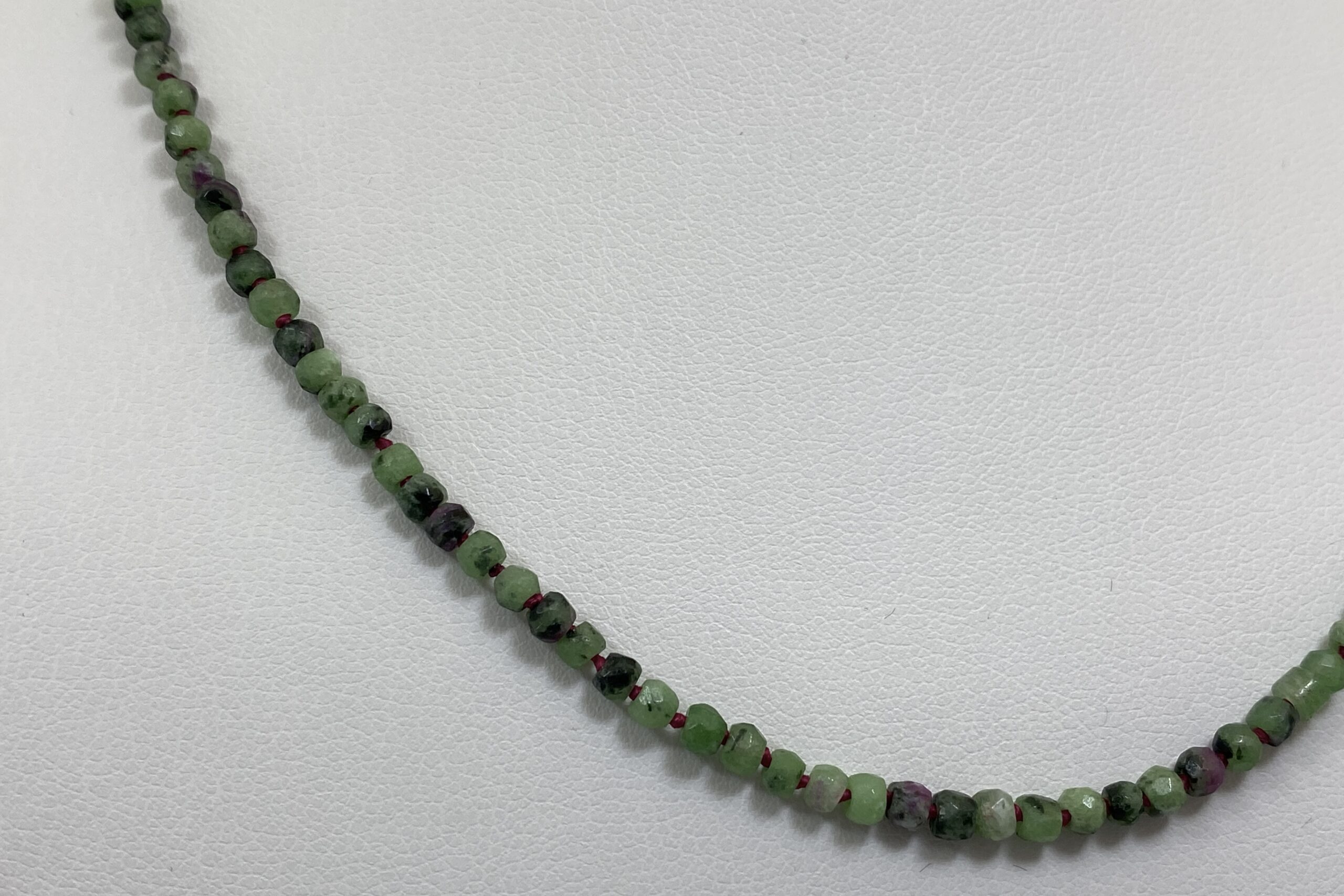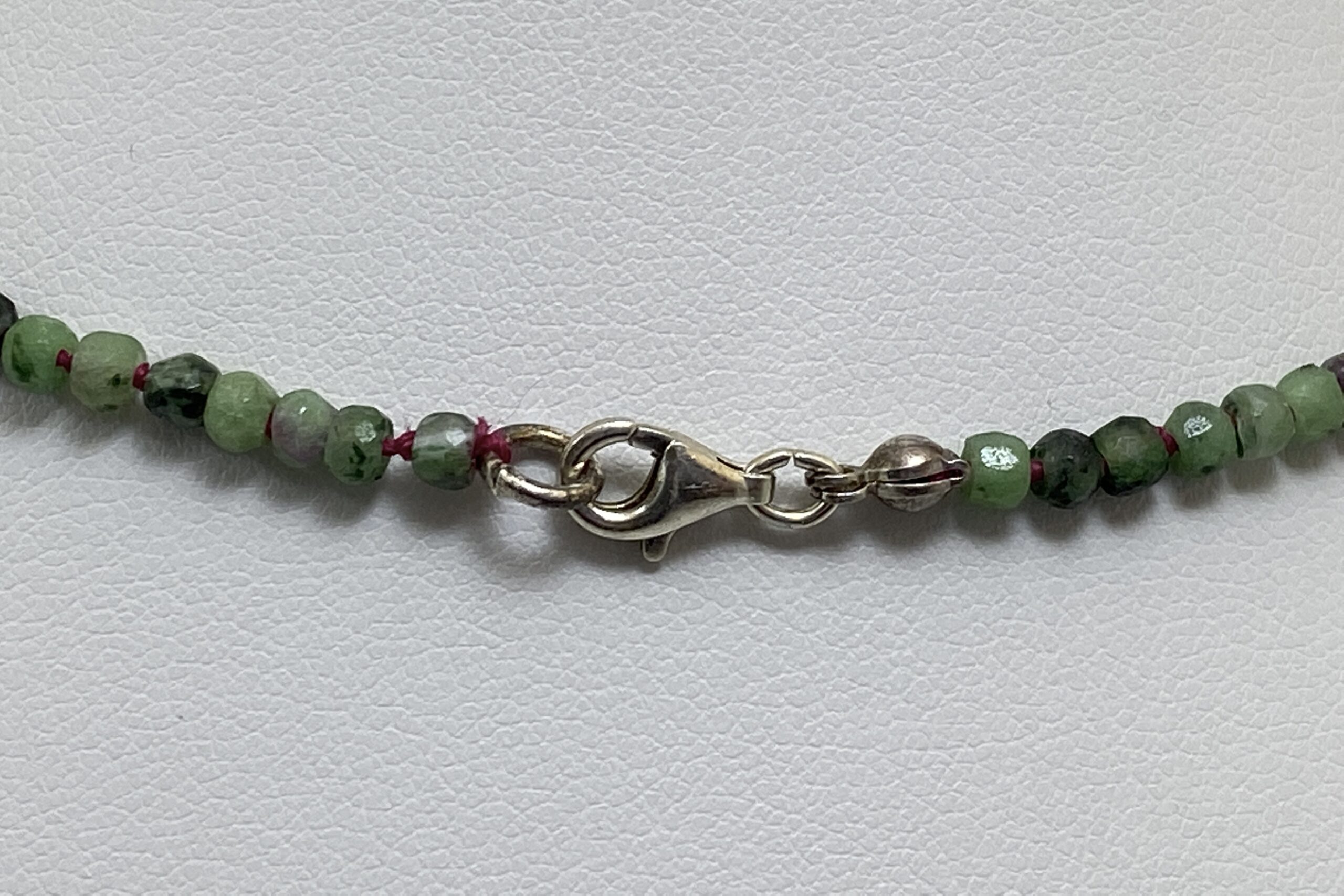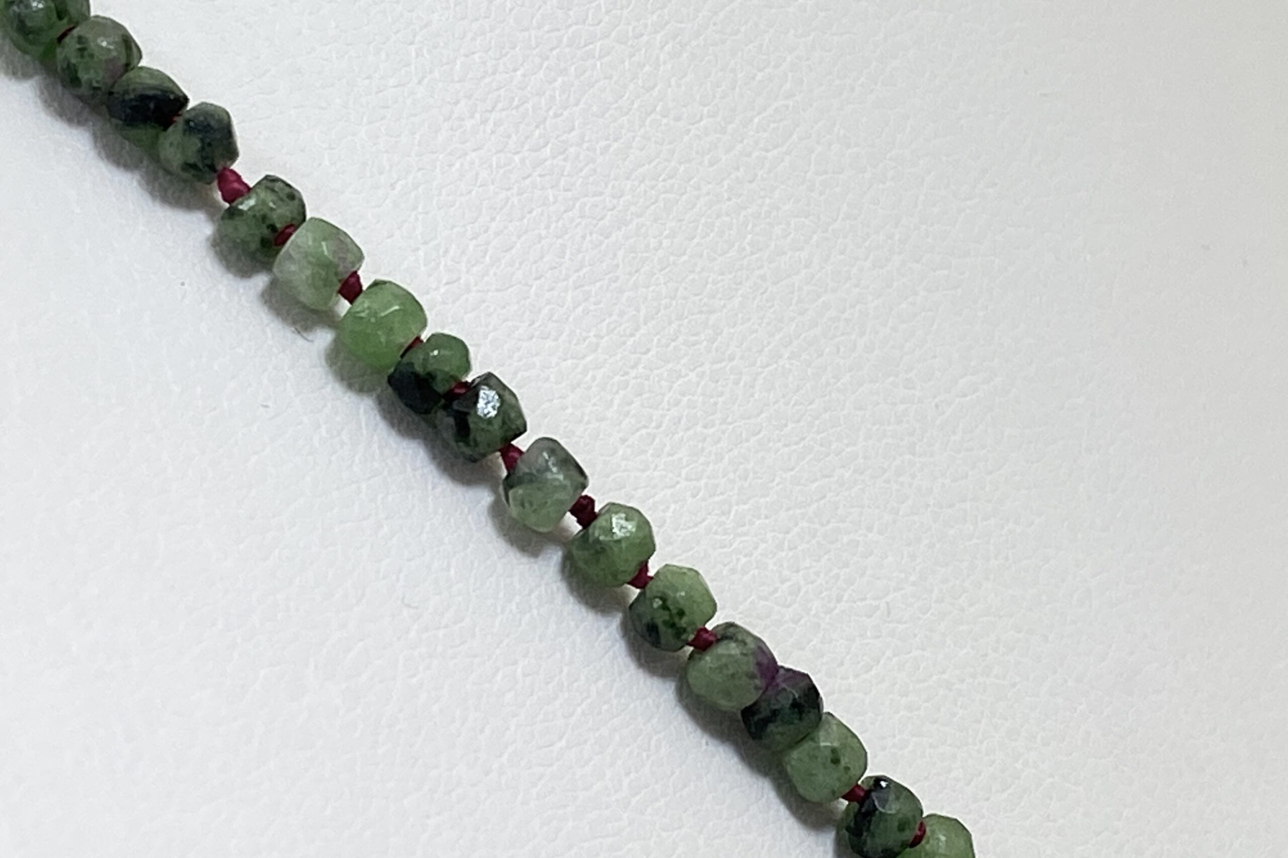 Unikátní náhrdelník z nepravidelně fasetovaných korálků zoisitu s rubínem a fuchsitu. Náhrdelník je navlečen na červené hedvábné niti a je ručně ozdobně prouzlíkován.
