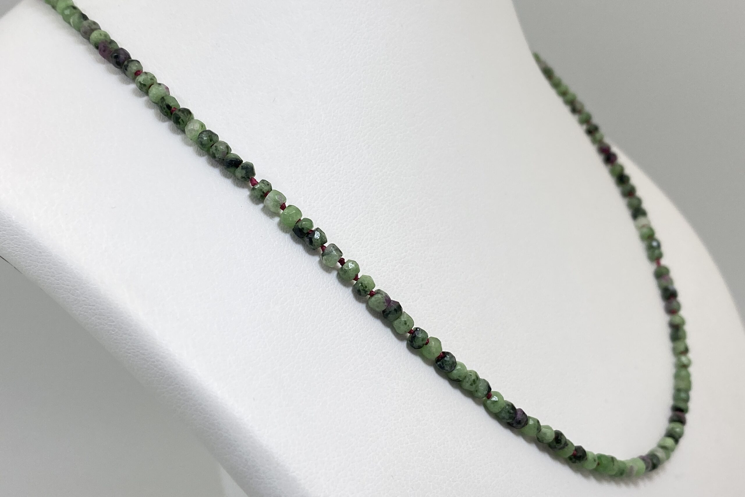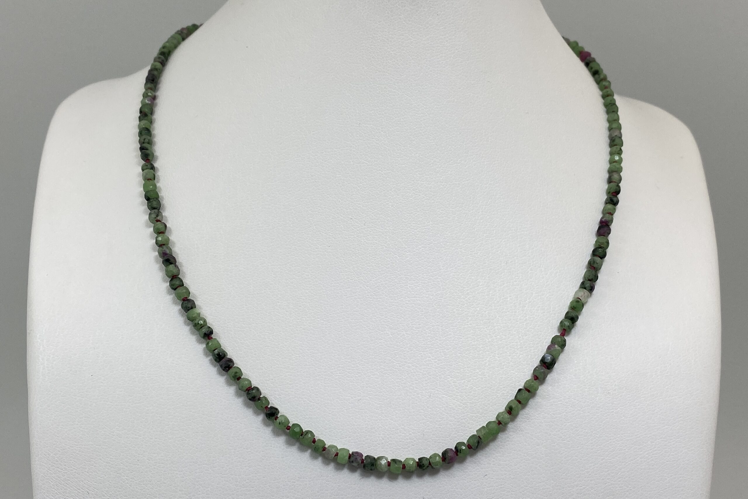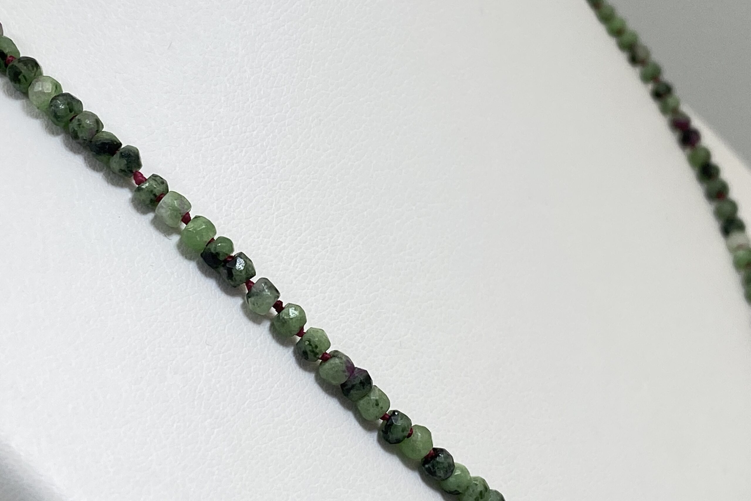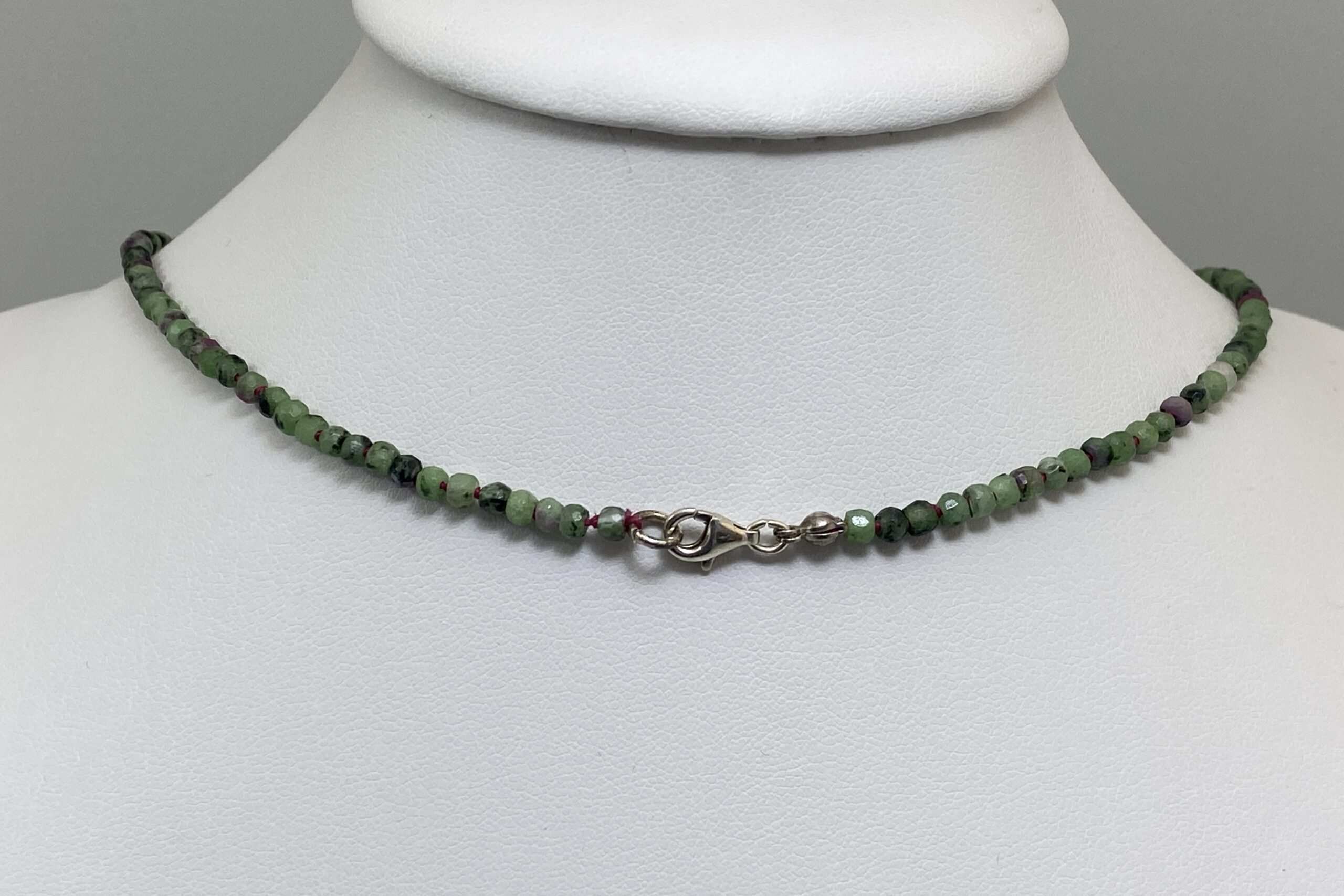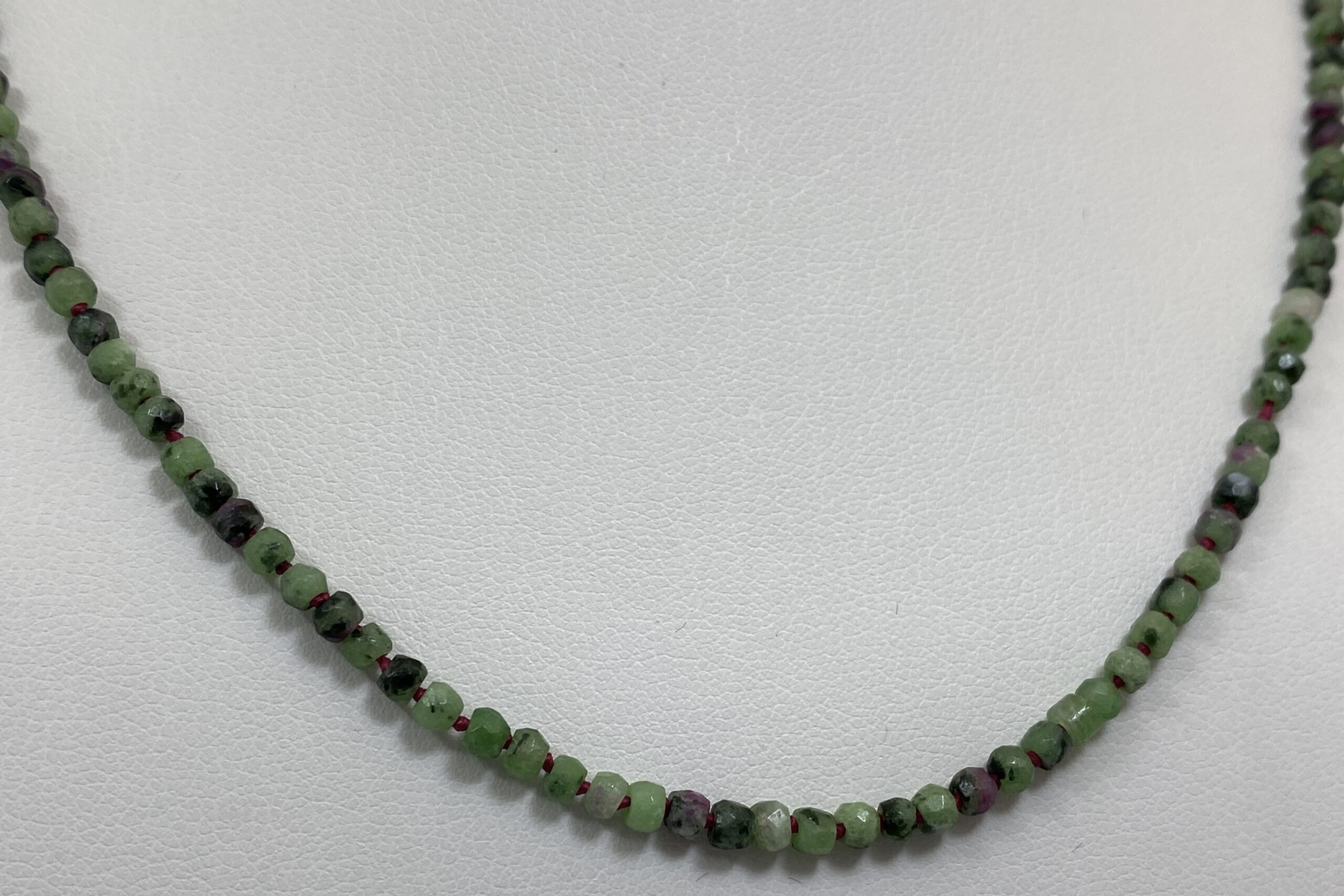 Unikátní náhrdelník z nepravidelně fasetovaných korálků zoisitu s rubínem a fuchsitu. Náhrdelník je navlečen na červené hedvábné niti a je ručně ozdobně prouzlíkován.