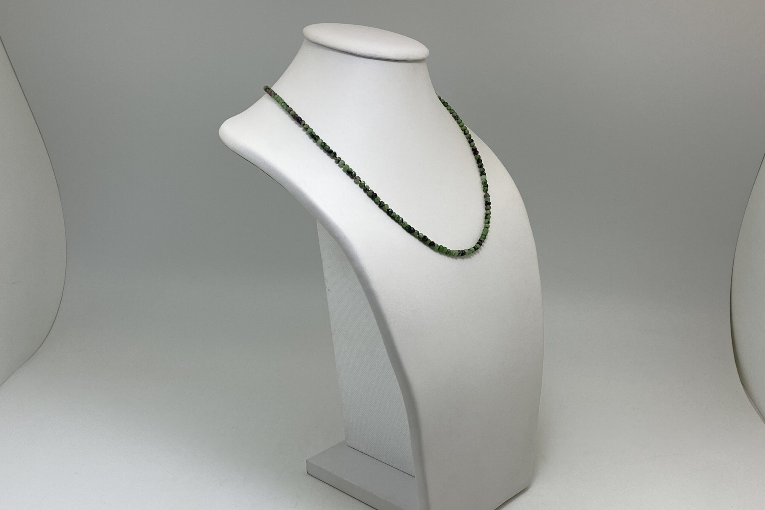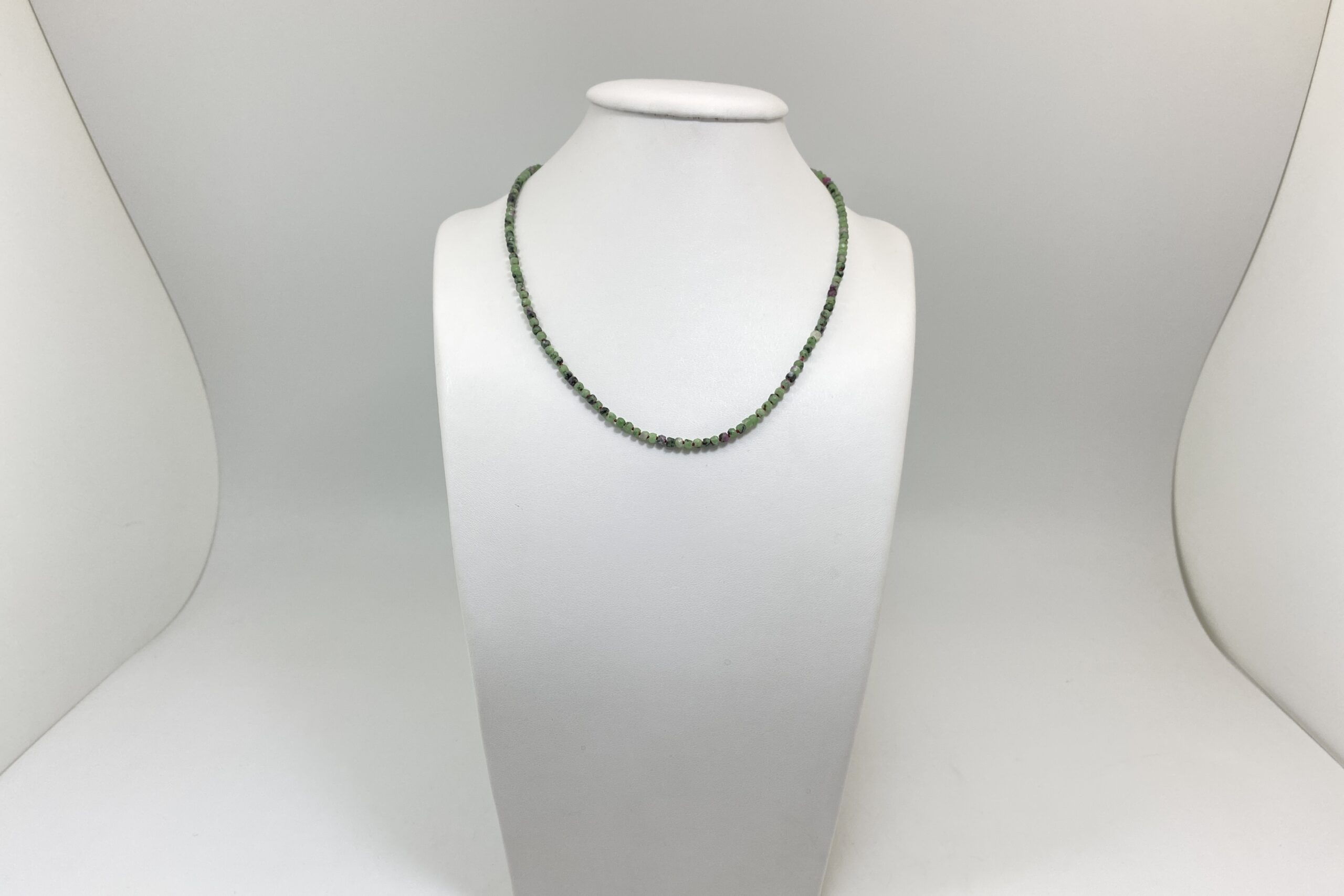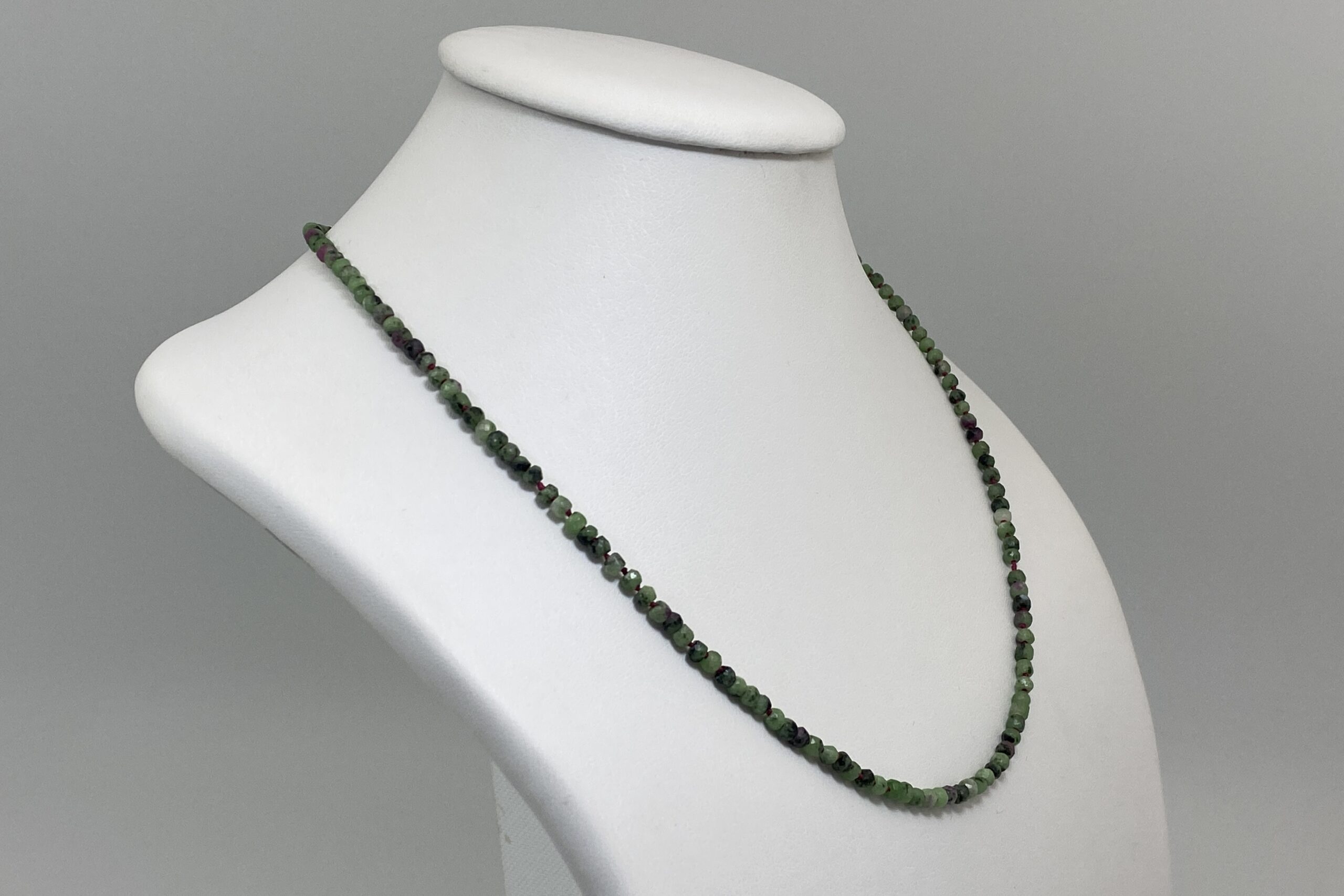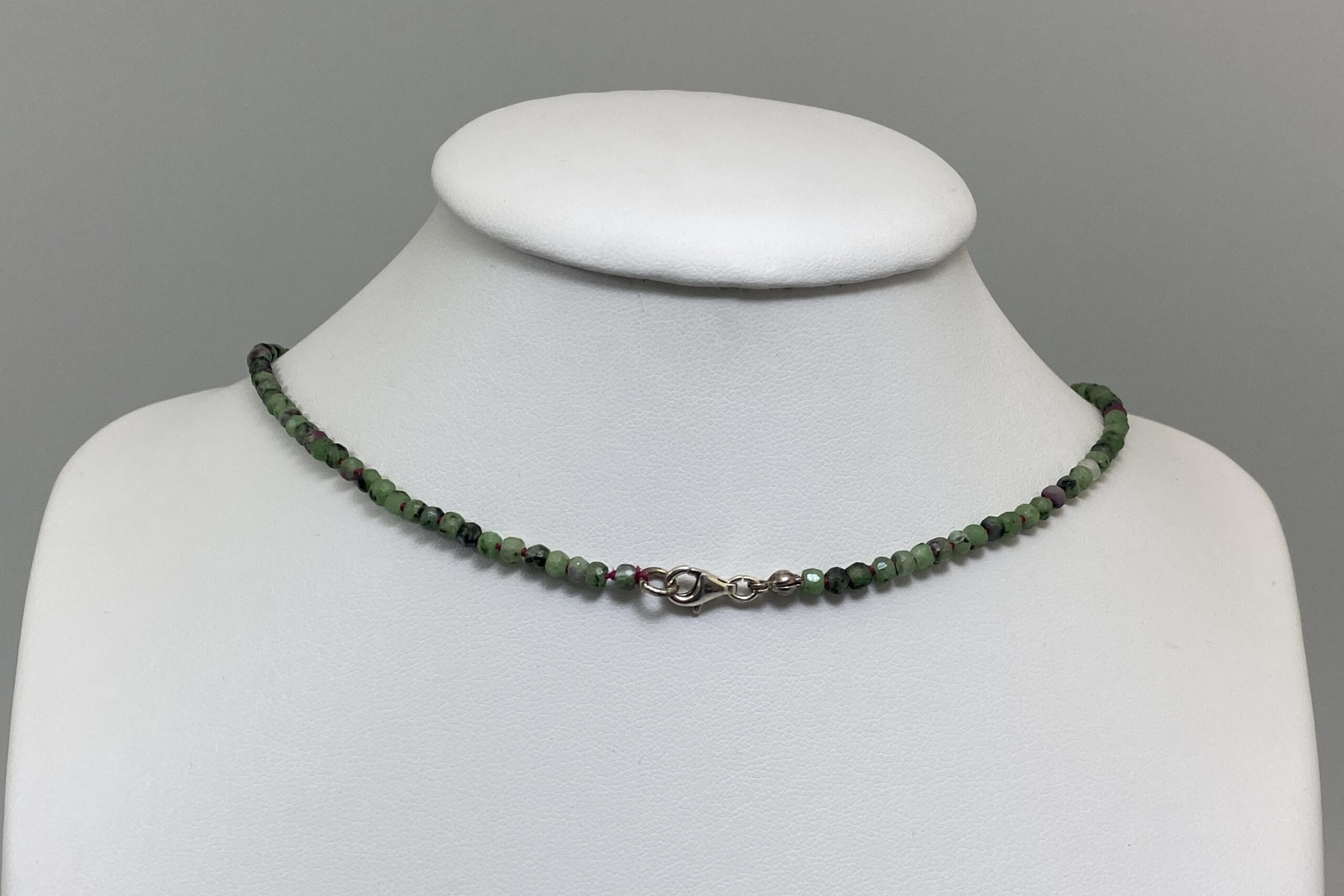Unikátní náhrdelník z nepravidelně fasetovaných korálků zoisitu s rubínem a fuchsitu. Náhrdelník je navlečen na červené hedvábné niti a je ručně ozdobně prouzlíkován.