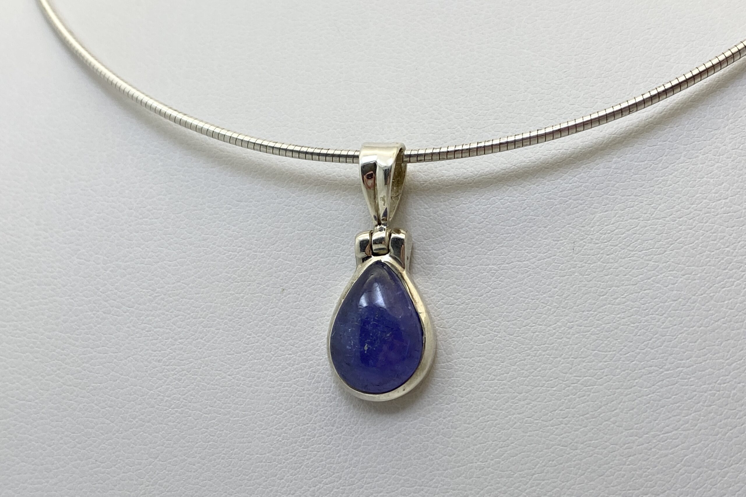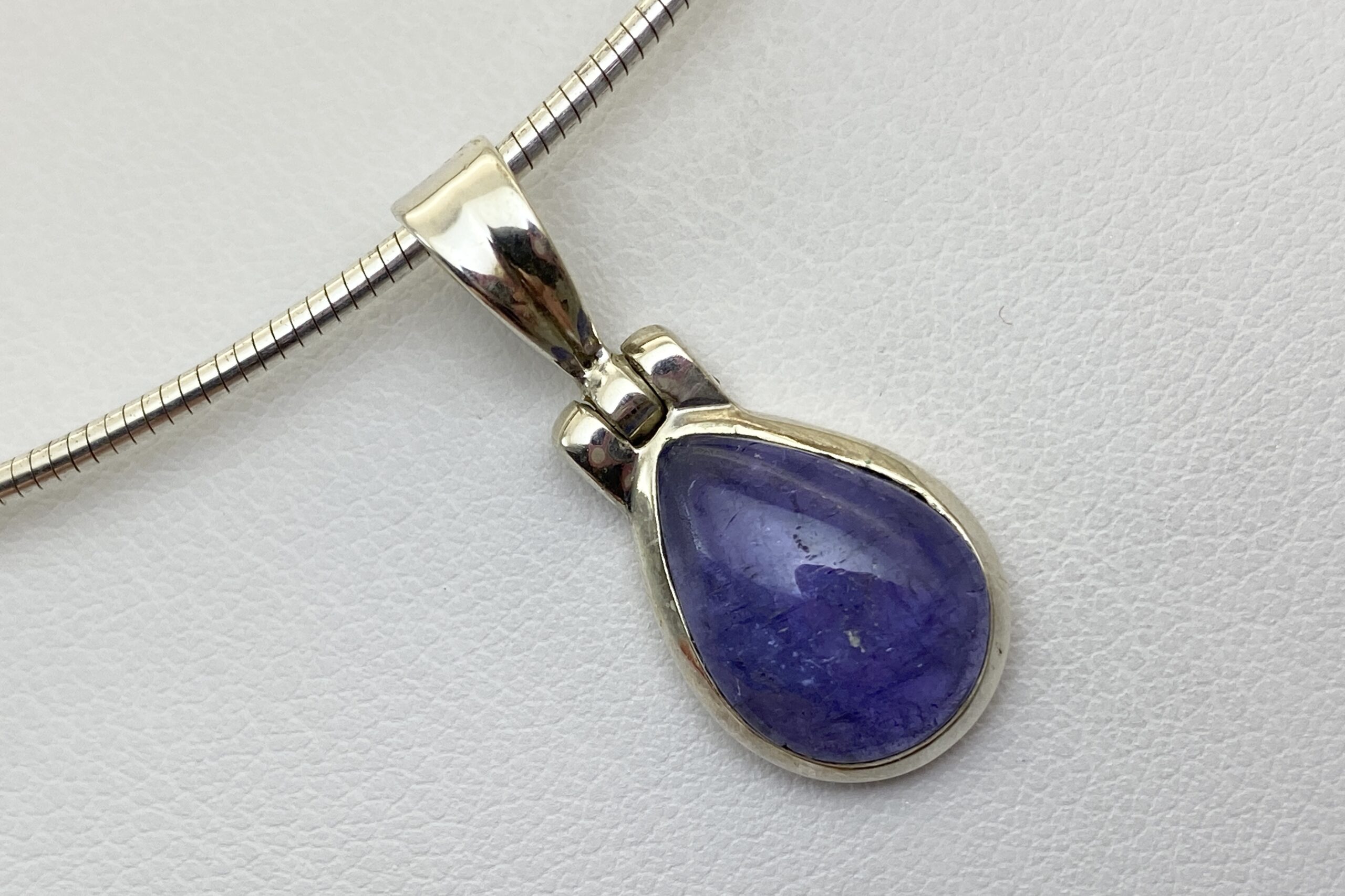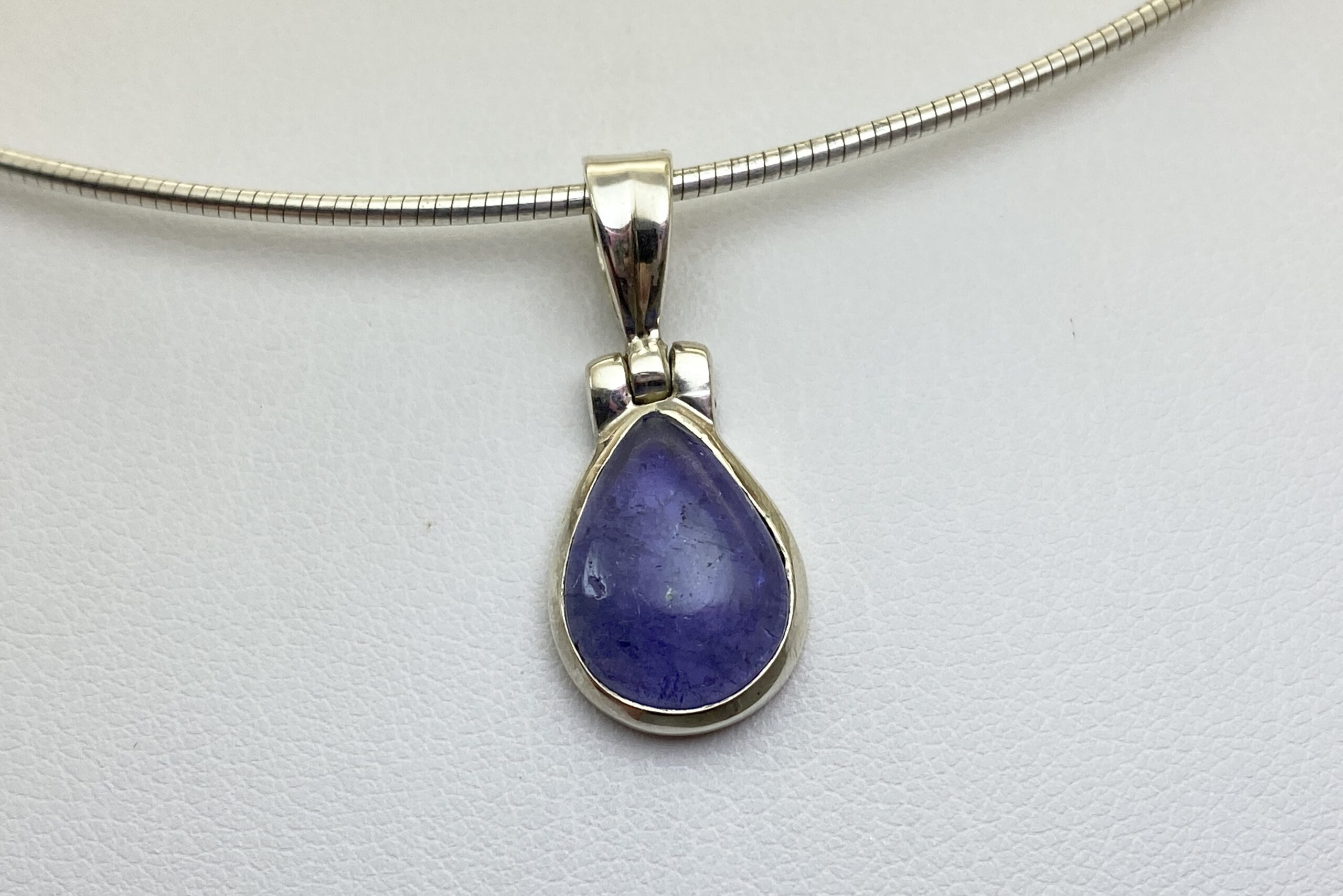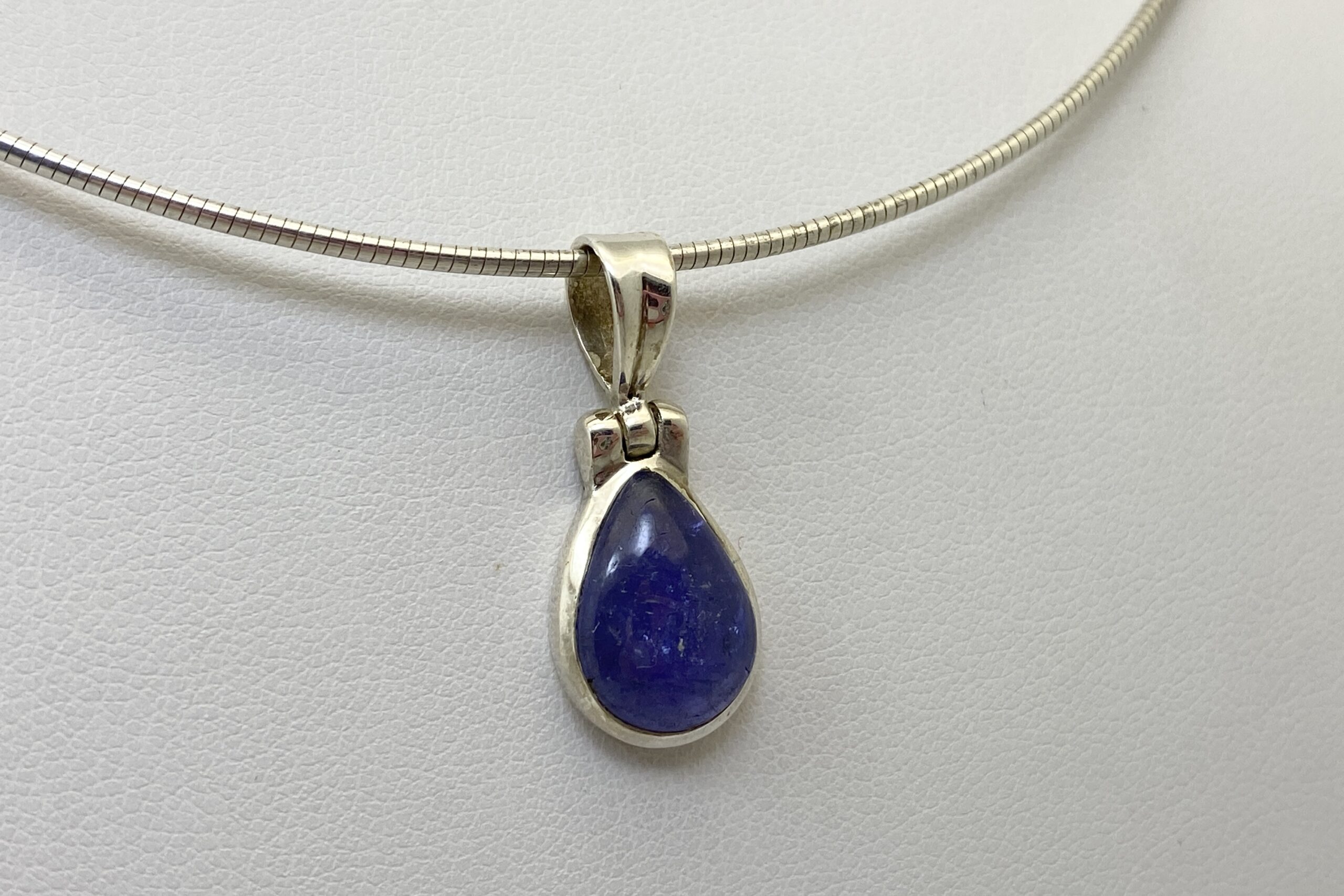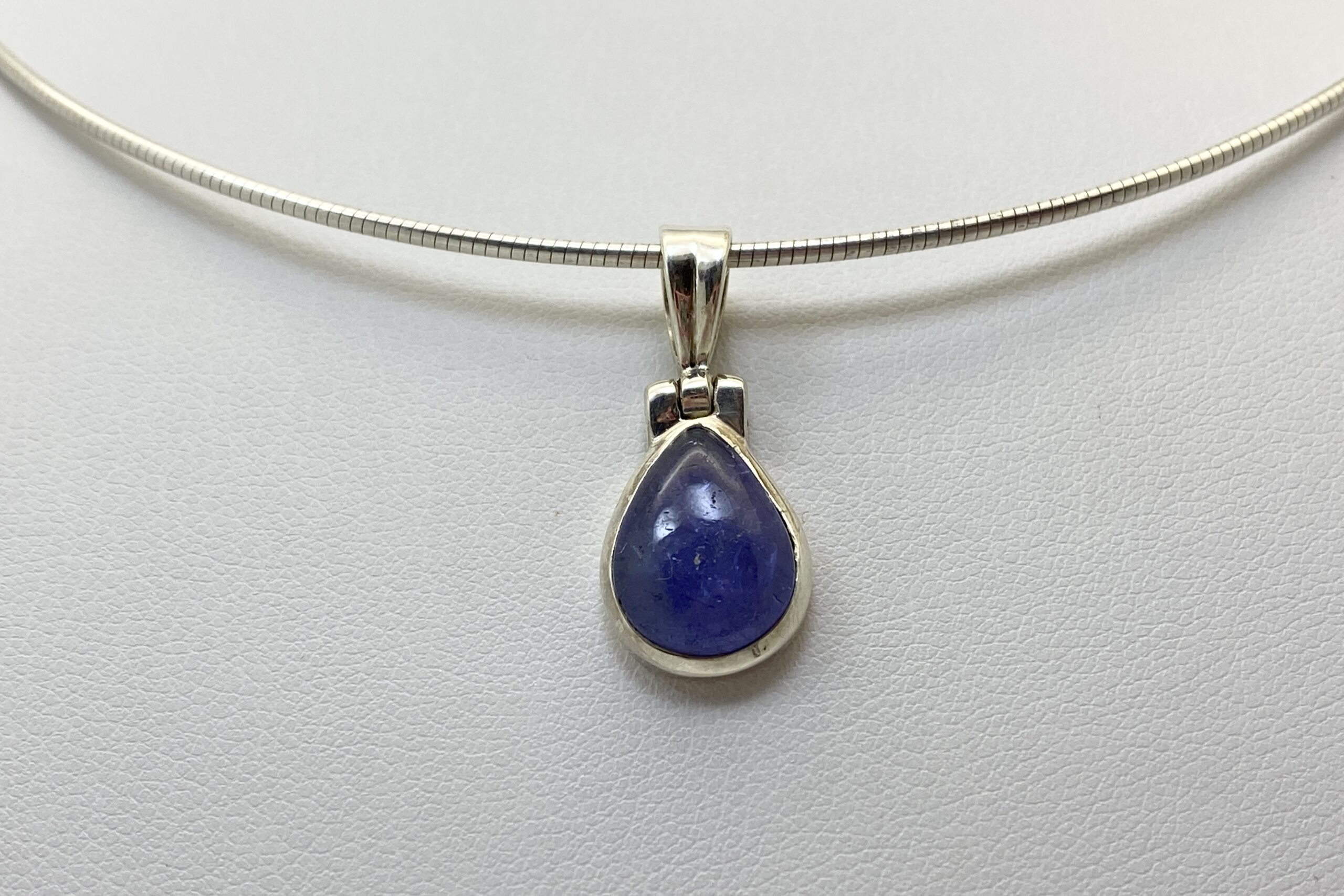 Elegantní přívěsek s kabošonem ve tvaru kapky z krásně modrého tanzanitu.