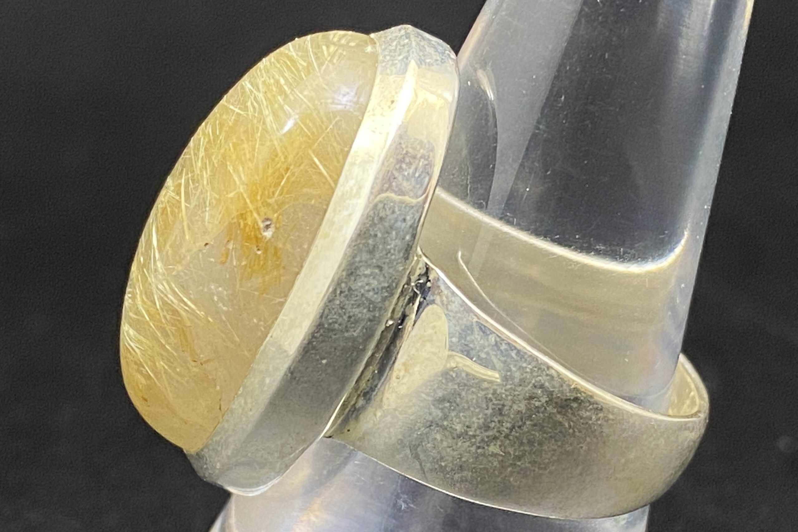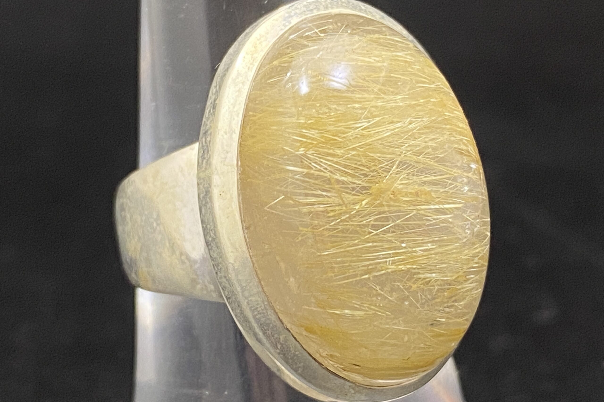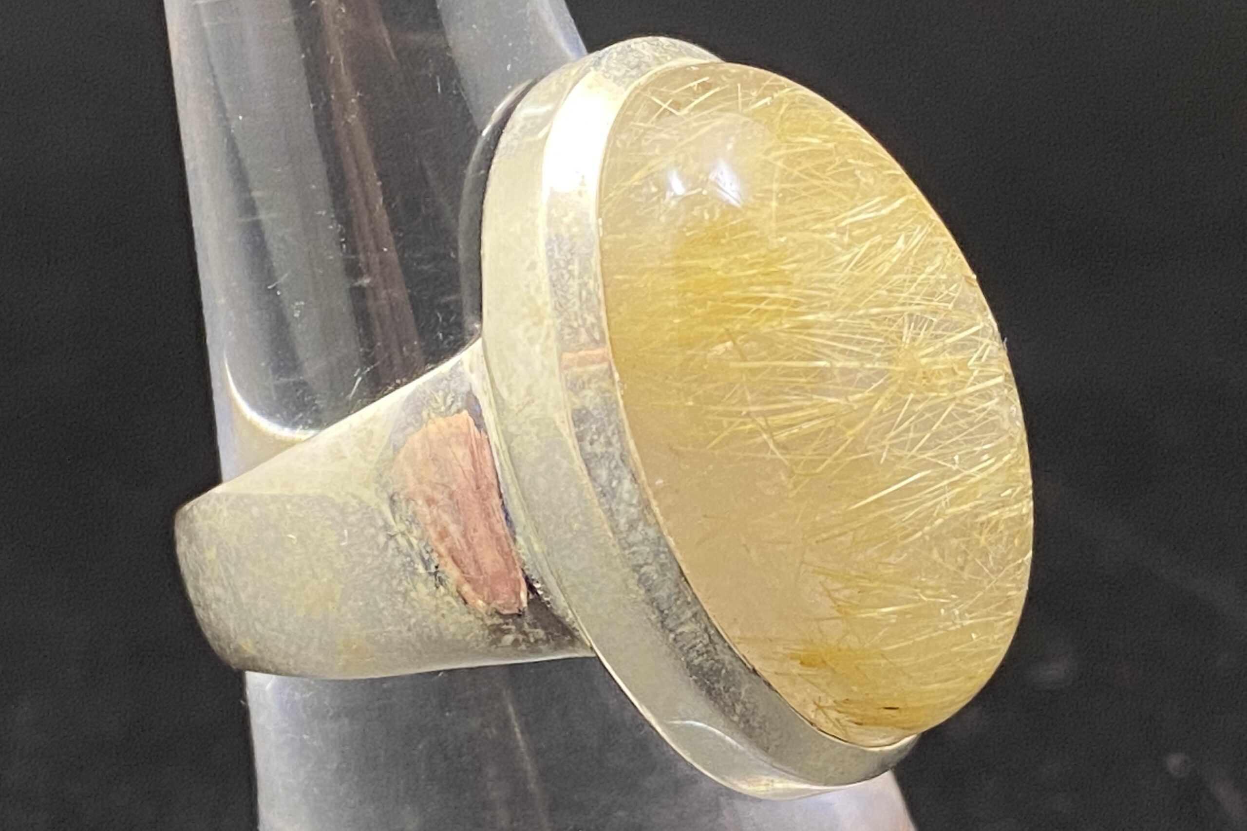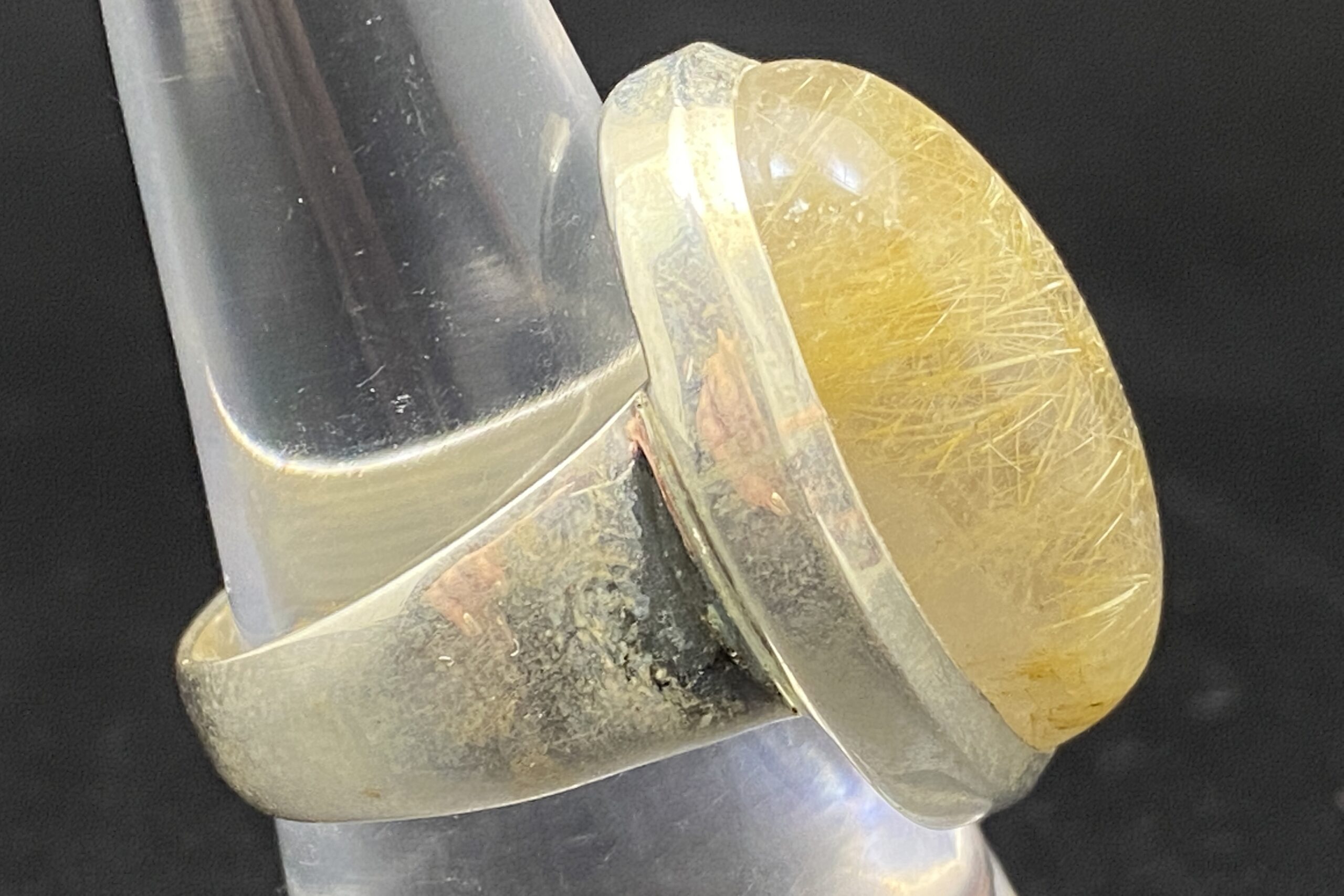 Jedinečný prsten s nádherným kabošonem sagenitu (jehlice rutilu zarostlé v průhledném křišťálu – tzv. sagenit nebo také „venušiny vlasy“).