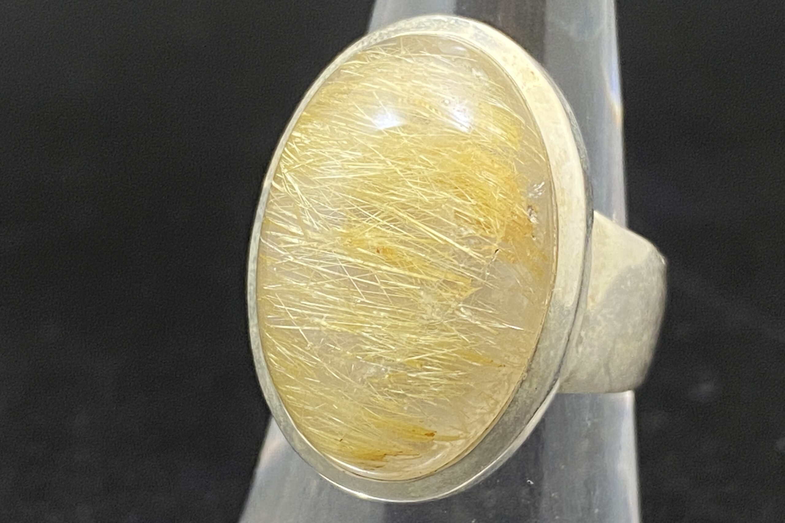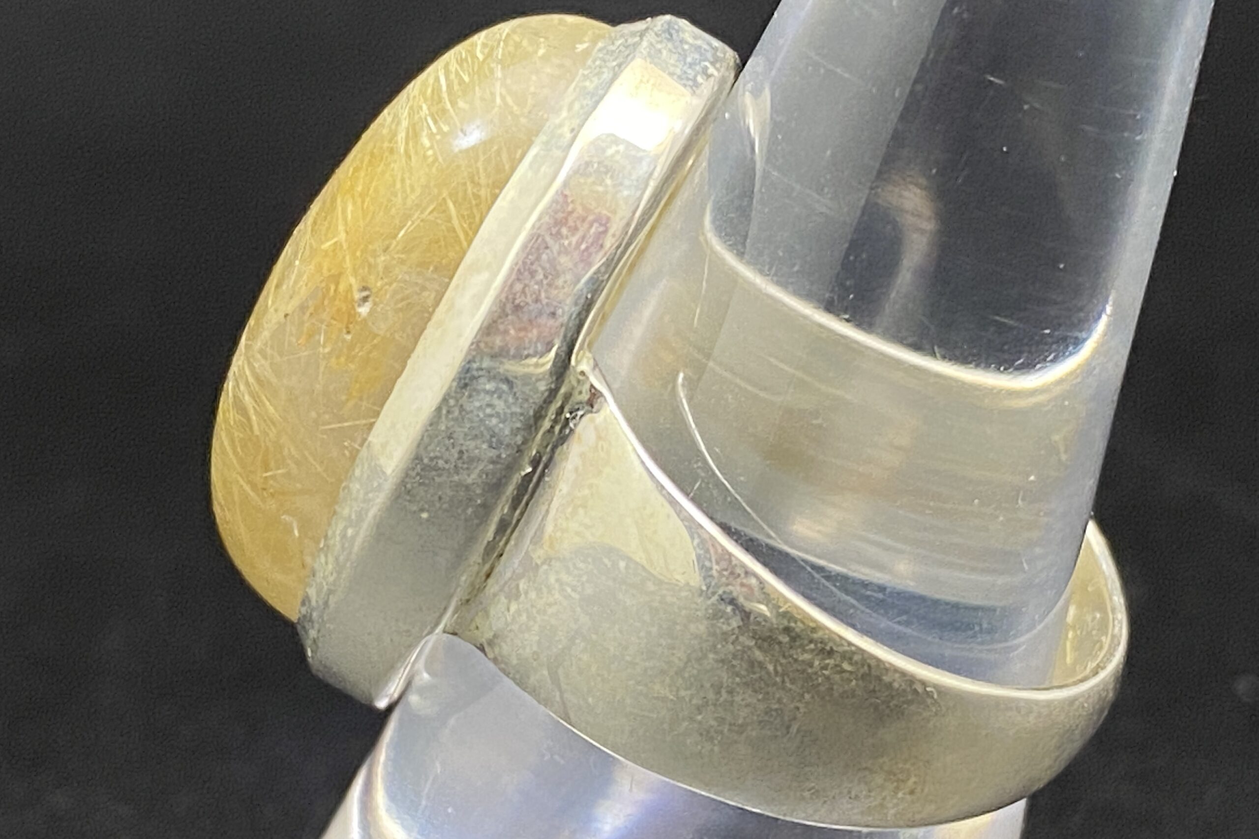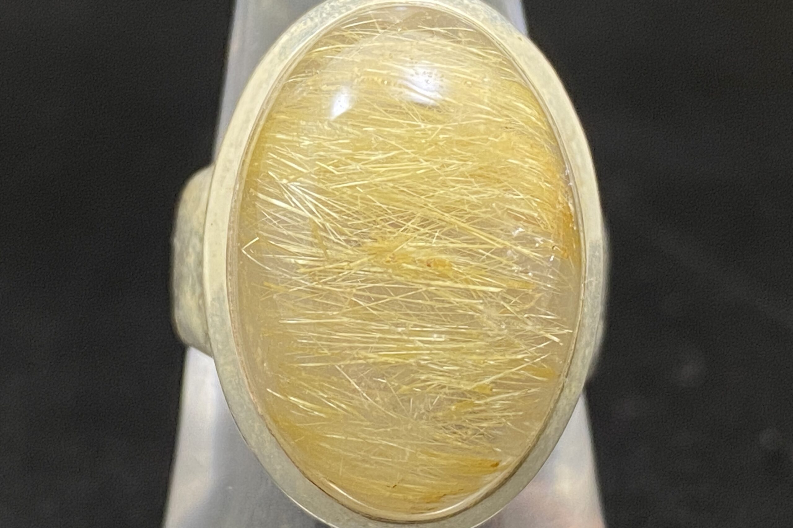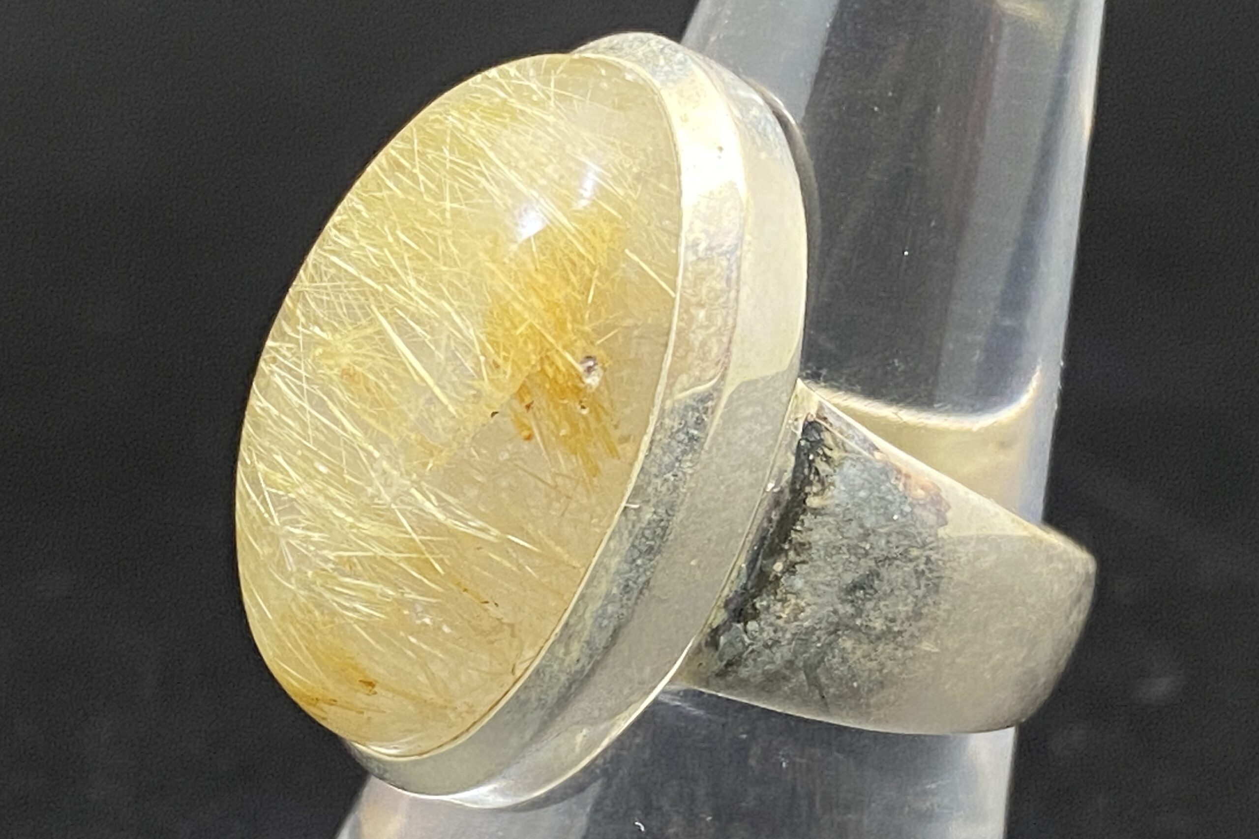 Jedinečný prsten s nádherným kabošonem sagenitu (jehlice rutilu zarostlé v průhledném křišťálu – tzv. sagenit nebo také „venušiny vlasy“).
