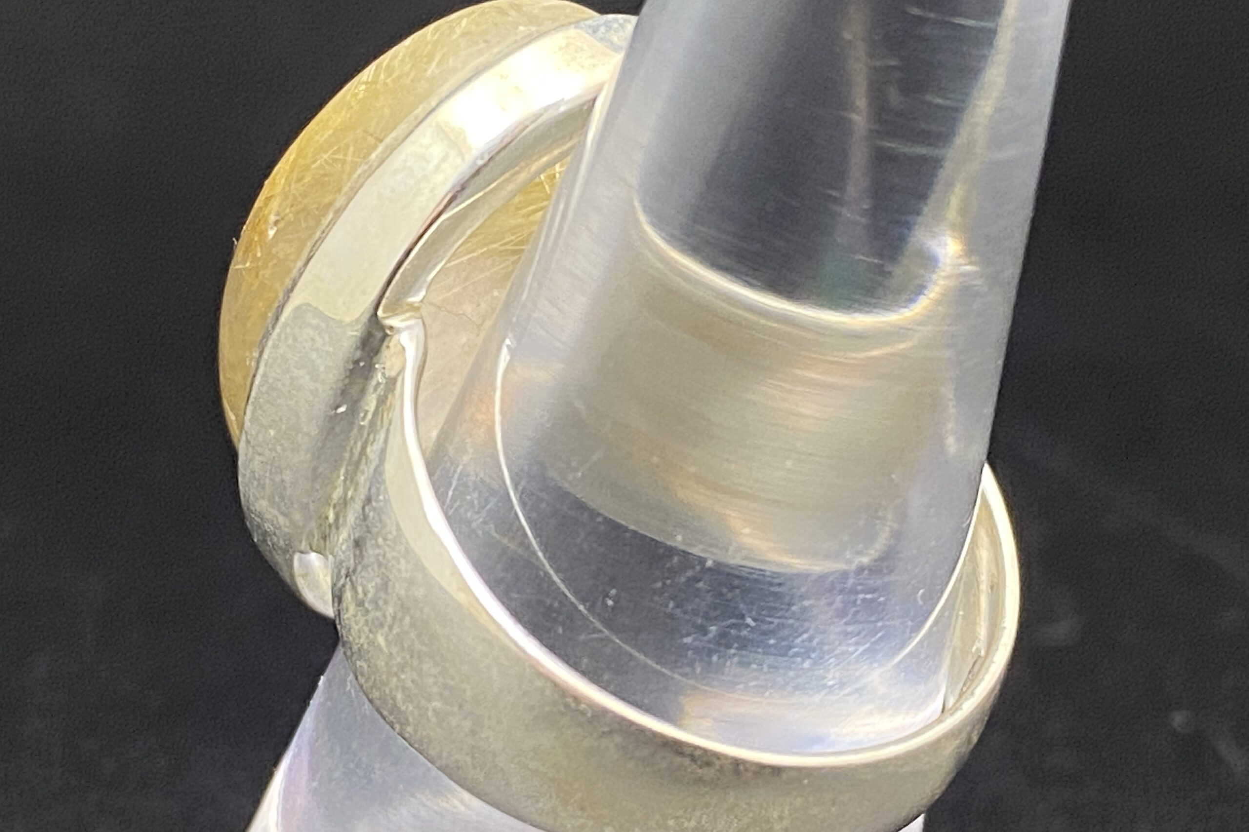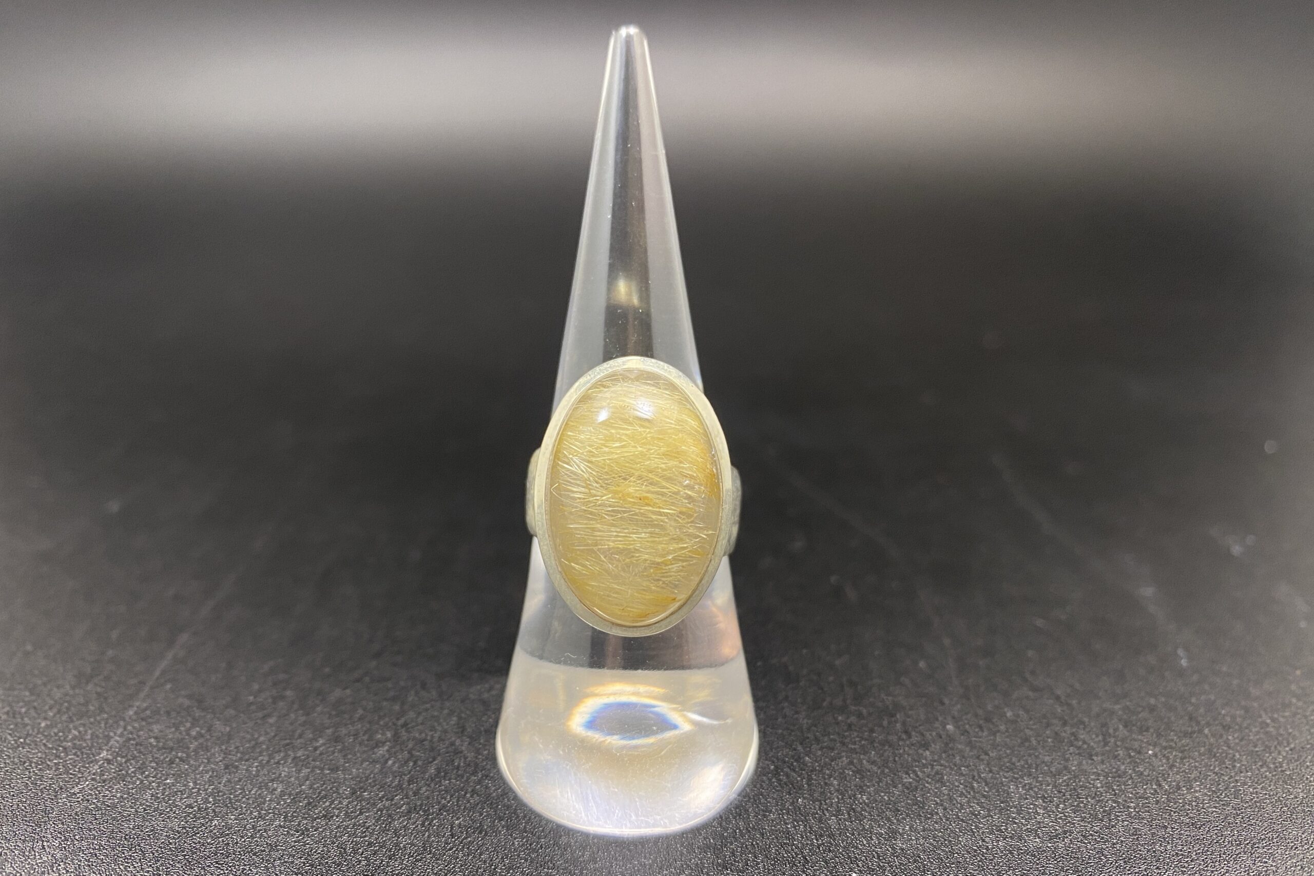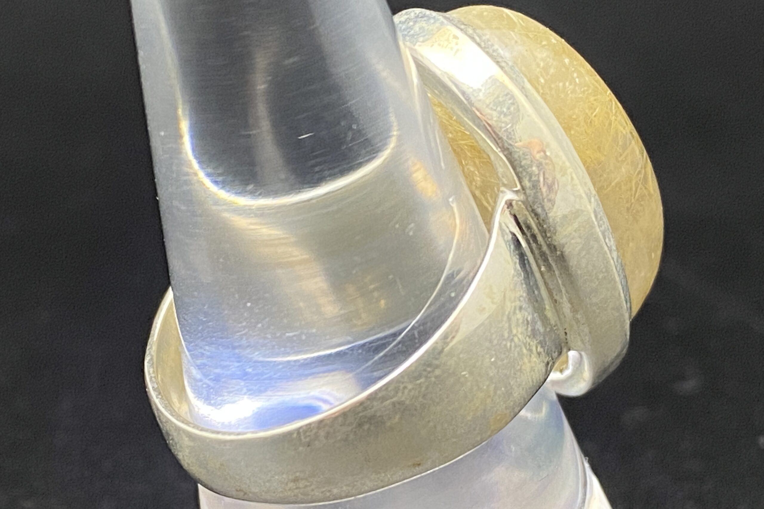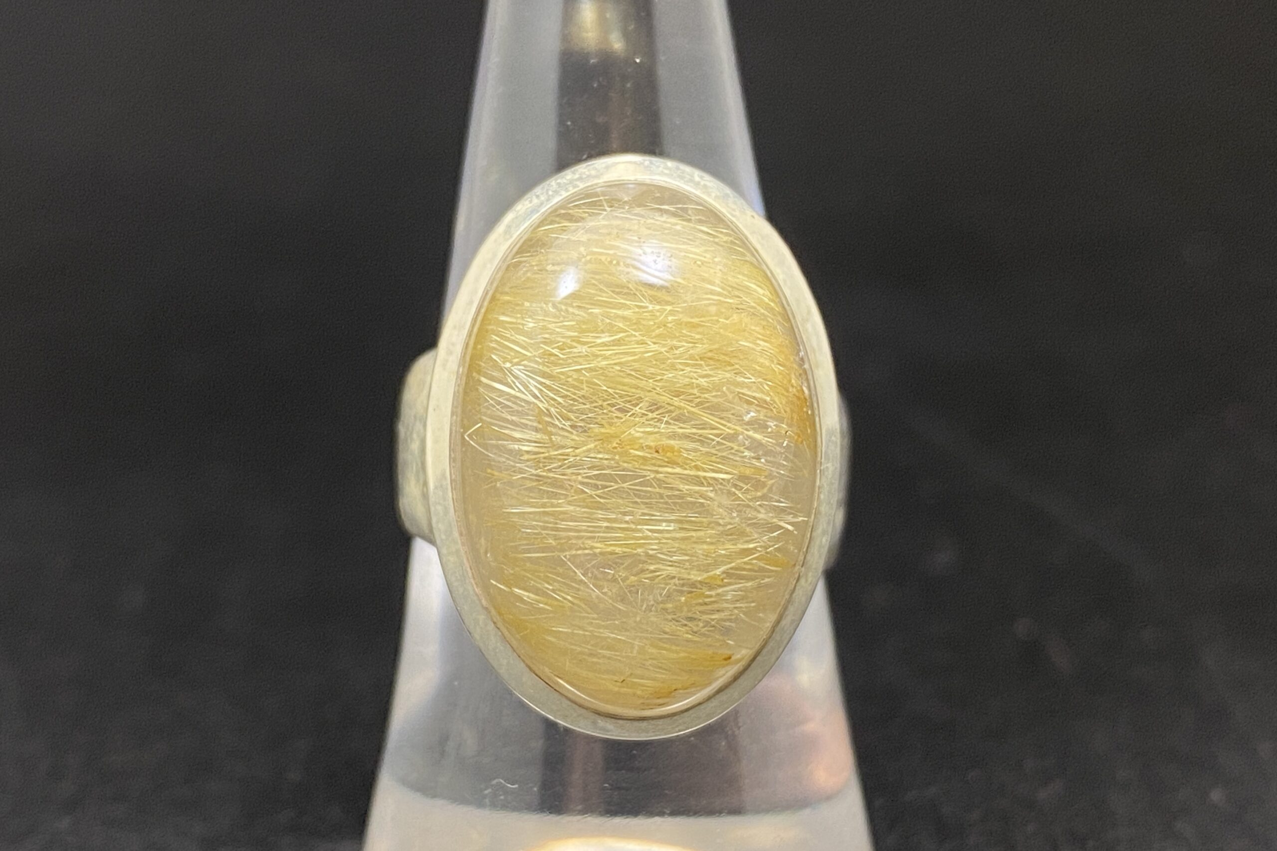 Jedinečný prsten s nádherným kabošonem sagenitu (jehlice rutilu zarostlé v průhledném křišťálu – tzv. sagenit nebo také „venušiny vlasy“).
